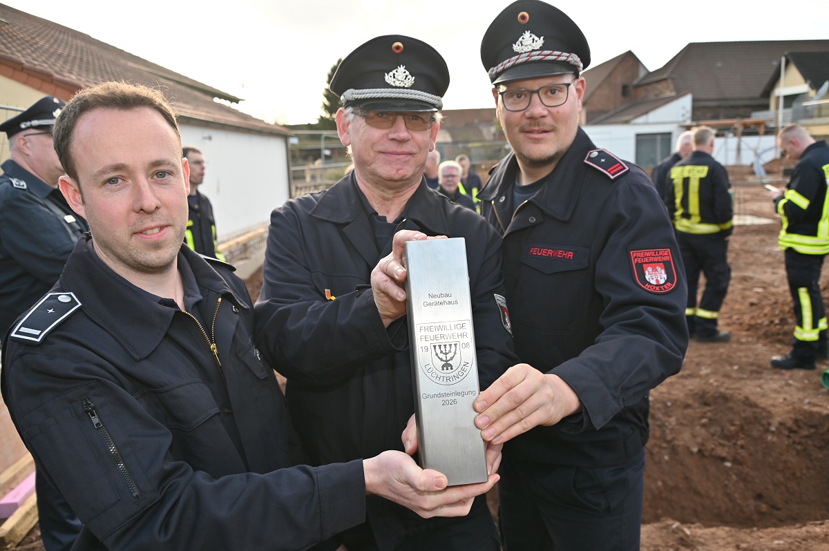 Architekt Schmidt verwies auf die durchdachte Planung des Neubaus: „Das Gebäude ist funktional gegliedert, bietet kurze Wege und schafft sichere sowie zeitgemäße Arbeitsbedingungen für die Einsatzkräfte.“ Der Neubau wird in Massivbauweise mit Flachdach errichtet. Mit der Ausführung der Bauarbeiten ist die Firma Nolte Hochbau beauftragt. Ein besonderer Schwerpunkt liegt auf Nachhaltigkeit und Energieeffizienz: Die Beheizung erfolgt über eine Wärmepumpe, sämtliche Räume werden mit Fußbodenheizung ausgestattet, während in der Fahrzeughalle die Bodenplatte thermisch aktiviert wird. Zusätzlich ist auf dem Flachdach eine Photovoltaikanlage vorgesehen. Insgesamt verfügt das Gebäude über eine Nutzfläche von rund 565 Quadratmetern bei einem Bruttorauminhalt von etwa 2.780 Kubikmetern. Der Alarmzugang erfolgt über den Plattenweg, an dem auch die Alarmparkplätze angeordnet sind. Der öffentliche Eingang sowie die Feuerwehrausfahrt orientieren sich zur Allenbergstraße und sorgen für klare und sichere Abläufe im Einsatzfall. Wehrführer Jürgen Schmits machte deutlich, wie notwendig der Neubau ist: „Das bisherige Gerätehaus aus dem Jahr 1964 entsprach nicht mehr den heutigen Anforderungen. Der Neubau ist ein wichtiger Schritt, um Einsatzbereitschaft, Ausbildung und Arbeitsschutz dauerhaft sicherzustellen.“ Auch Löschgruppenführer Bohnenpoll sieht der Zukunft positiv entgegen: „Mit den neuen Räumlichkeiten schaffen wir beste Voraussetzungen für eine leistungsfähige Feuerwehr und zeitgemäße Ausbildung. Davon profitieren sowohl die Aktiven als auch der Nachwuchs.“