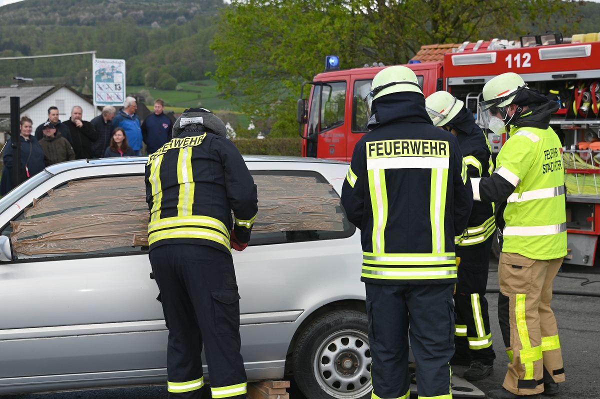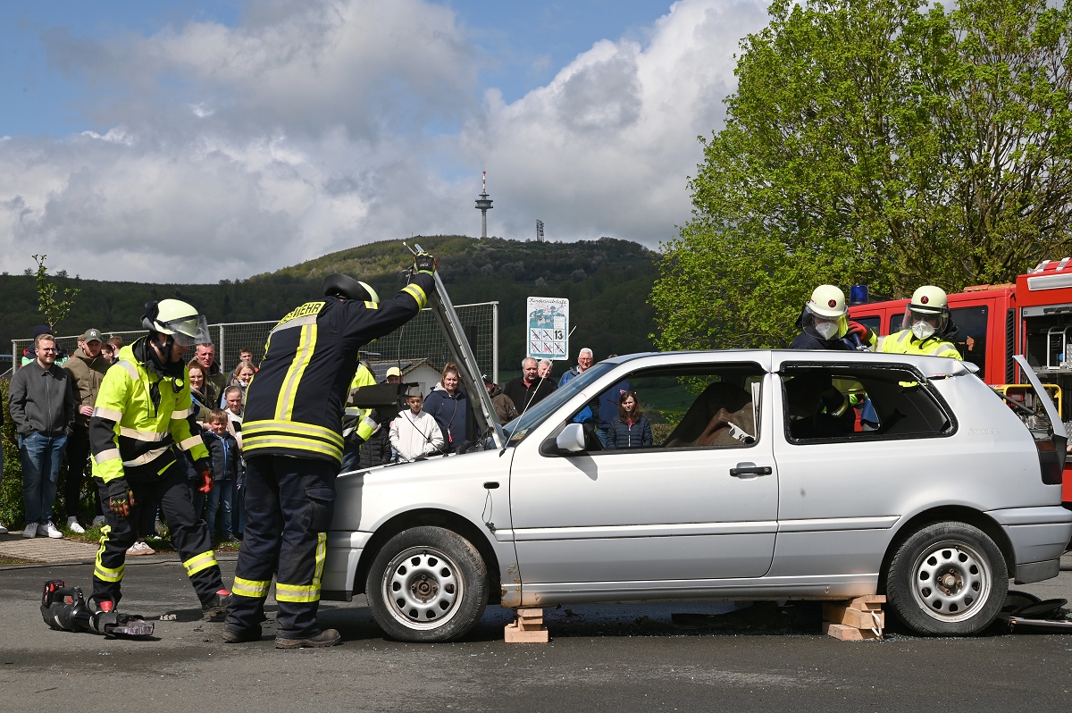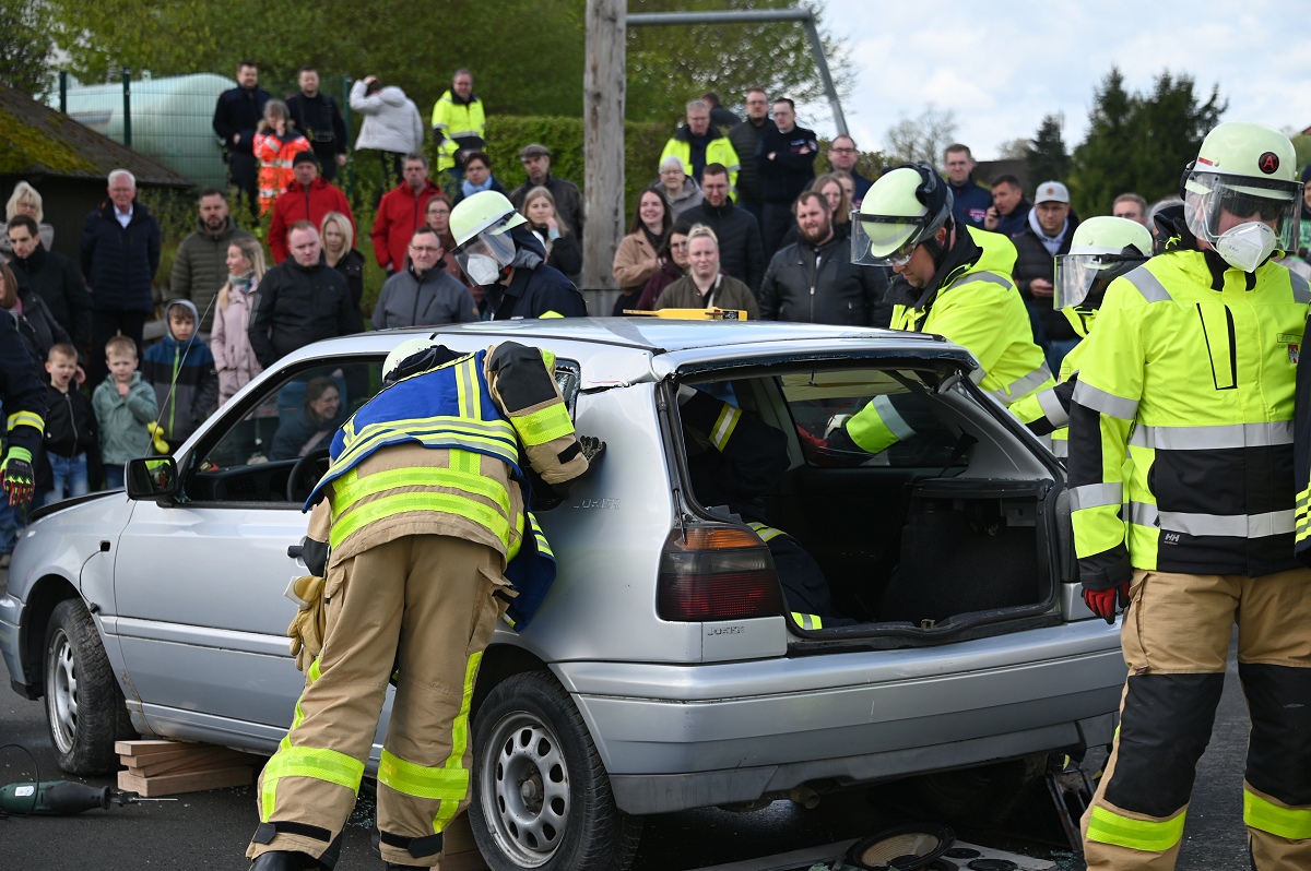Großes Interesse zog zudem eine realitätsnahe Einsatzübung auf dem Schützenplatz auf sich. Die Löschgruppe Fürstenau zeigte gemeinsam mit dem Löschzug Höxter, wie die Feuerwehr bei einem Verkehrsunfall mit eingeklemmter Person vorgeht. Vor den Augen von dutzenden Zuschauern wurde ein ausgemusterter Pkw fachgerecht zerlegt, um eine schonende Rettung des „Verletzten“ zu ermöglichen. Dabei musste unter anderem das Fahrzeugdach entfernt werden, um die verunfallte Person aus dem Fahrzeug zu befreien. Auch personell gab es einen wichtigen Moment: Der stellvertretende Leiter der Feuerwehr Höxter, Rainer Höppner, nahm die Ernennung zweier Führungskräfte vor. Die Brüder Benedikt und Philipp Meise wurden für weitere sechs Jahre in ihren Funktionen als Löschgruppenführer bestätigt. Benedikt Meise bleibt Löschgruppenführer, während Philipp Meise weiterhin als sein Stellvertreter fungiert.
