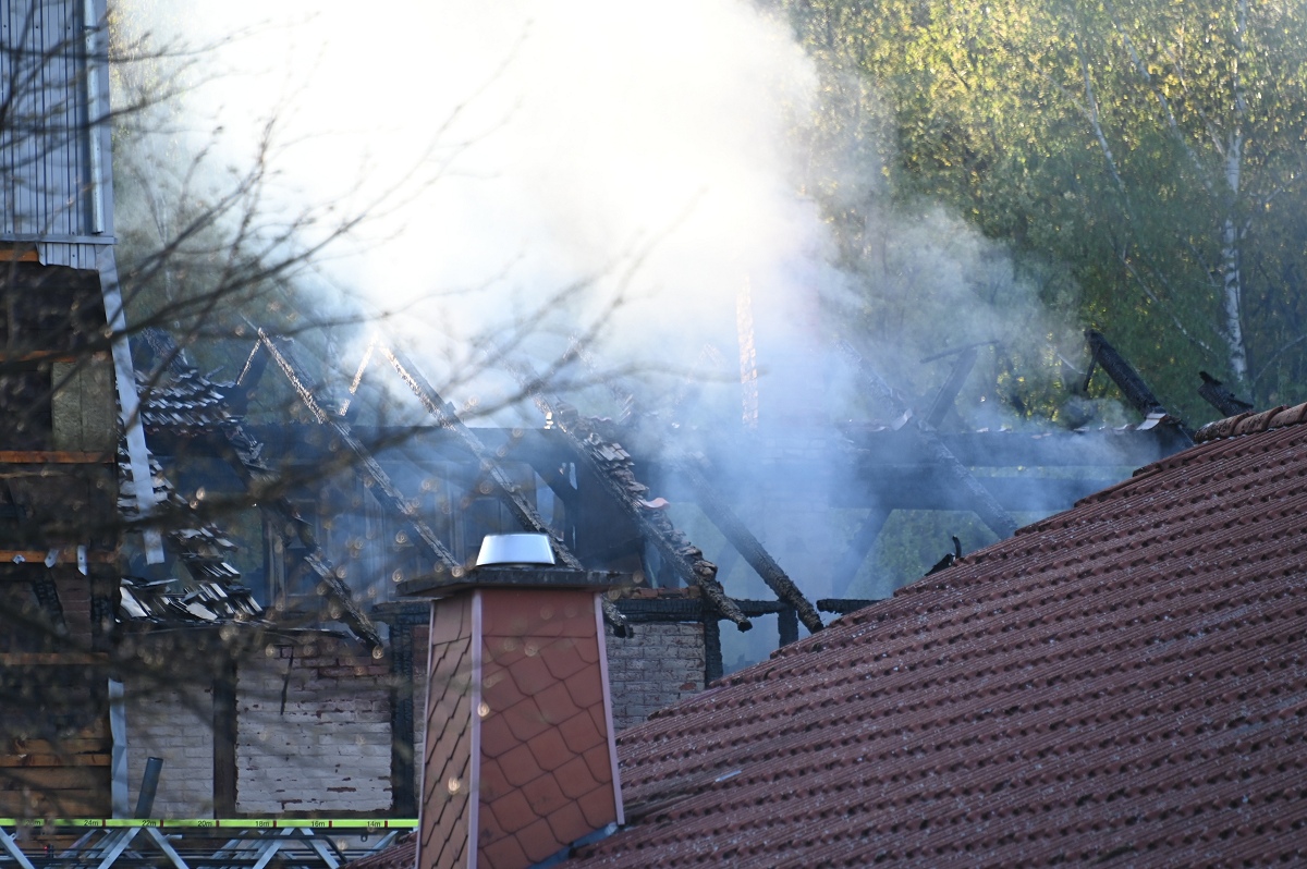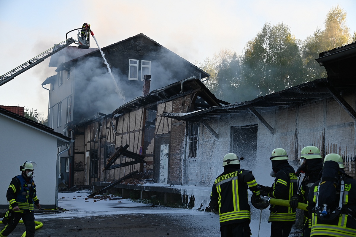 Beverungen (red). Nach dem Großbrand am Donnerstagnachmittag auf dem Gelände des Alten Bahnhofs in Beverungen liegen inzwischen weitere Erkenntnisse zum Einsatzverlauf und zum Ausmaß der Schäden vor. Demnach bestätigte sich, dass das Feuer im Bereich eines Anbaus ausbrach und sich von dort rasch ausbreitete. Eine Zeugin hatte gegen 16 Uhr Rauch aus dem Anbau des früheren Bahnhofsgebäudes bemerkt und die Einsatzkräfte alarmiert. Beim Eintreffen von Feuerwehr und Polizei stand der Dachstuhl bereits in Flammen, gegen 17 Uhr war er vollständig ausgebrannt. Das Feuer beschränkte sich nach Angaben der Einsatzleitung auf den Anbau, in dem unter anderem städtische Notunterkünfte untergebracht waren. Das angrenzende Gebäude mit einer Asylbewerberunterkunft blieb relativ verschont, wurde jedoch durch Hitze und Rauch ebenfalls in Mitleidenschaft gezogen. Die Feuerwehr kühlte das Gebäude vorsorglich dauerhaft, um ein Übergreifen der Flammen zu verhindern. Nach ersten Einschätzungen kann es vorerst nicht mehr bewohnt werden. Ein Anzeichen dafür sind die ausgelösten Rauchmelder im Gebäude, die auch am Abend noch lautstark schrillten. Das bedeutet, dass Rauch weit bis in das Wohngebäude vorgedrungen ist, wie die Feuerwehr erklärte. Die Bewohner wurden zunächst an anderen Orten untergebracht.