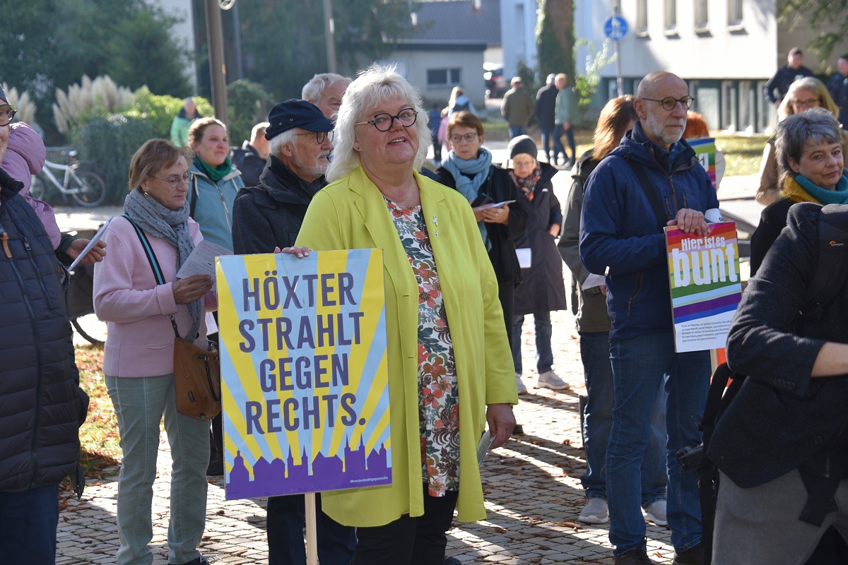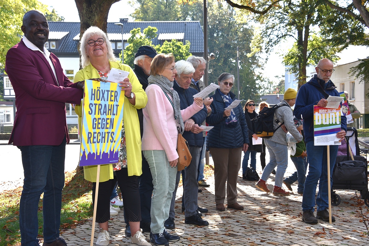 Höxter (TKu). Etwa 100 Teilnehmende setzten am Tag der Deutschen Einheit ein besonderes Zeichen für „Einigkeit und Recht und Freiheit“. Organisiert vom „Bündnis für Demokratie und Vielfalt Höxter“ haben die 100 Teilnehmer mit dem vom Aller.Land-Programm geförderten Projekt „Starke Worte. Starke Orte“ ein klares Zeichen für Freiheit, Toleranz und Zusammenhalt gesetzt. Über der Veranstaltung stand das Motto „Einigkeit und Recht und Freiheit“, Worte, die aktueller denn je wirken. Versammlungsleiter und Bündnis-Sprecher Helmut Lensdorf eröffnete die Kundgebung: „Wir wollen Haltung zeigen für Demokratie und Vielfalt.“ Damit gab er den Ton für ein Programm vor, das Politik, Kultur und Musik miteinander verband. Für den musikalischen Rahmen sorgte Singer-Songwriter Phil Solo aus Detmold zusammen mit dem Musiker Hans Hermann Jansen, die das Thema „Zusammenhalt und Solidarität“ eindringlich vertonten. Maja Machalke vom Projektteam „Starke Worte. Starke Orte“ nahm die berühmten Hymnenzeilen zum Anlass für eine pointierte Analyse. „Einigkeit bedeutet, auch Unterschiedlichkeit auszuhalten. Recht heißt, das Richtige zu tun. Und Freiheit bedeutet nicht, alles machen zu können, was man will, sondern dass alle ihren Freiheitsraum leben dürfen.“ Ihre Worte waren zugleich Einladung und Ermutigung, das Ideal der Nationalhymne auf das Heute zu beziehen.