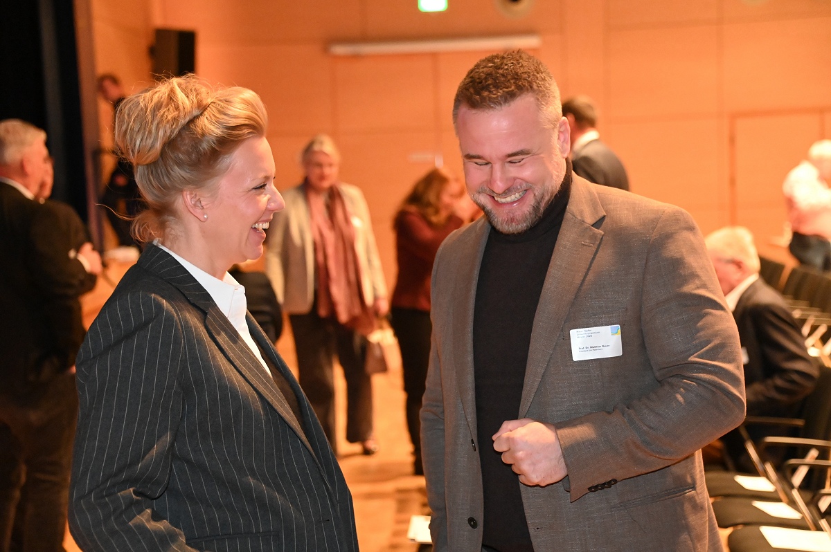 Auch Wissenschaftsministerin Brandes zeigte sich beeindruckt von der Unterstützung für den Hochschulstandort Höxter. Ihr Statement hätte nicht klarer sein können: „Wir brauchen auch die Studierenden aus dem ländlichen Raum mit ihren Erfahrungen, die sie hier gesammelt haben. Der Hochschulstandort steht im Studiengesetz, und daran hat sich bis heute nichts geändert. Ich bin sehr zuversichtlich, dass wir den Standort in Höxter behalten werden.“ Von einer ganz persönlichen Begegnung mit Prof. Dr. Klaus Töpfer berichtete sie ebenfalls. Dieser habe sich stets über alle Grenzen hinweg für den Umweltgedanken und die Nachhaltigkeit eingesetzt und sei ein sehr sympathischer Mensch gewesen. Bürgermeister Daniel Hartmann betonte die historische und symbolische Bedeutung der Residenz-Stadthalle, die 2004 von Klaus Töpfer eröffnet wurde: „Dass nun ausgerechnet hier das erste Klaus-Töpfer-Umweltsymposium stattfindet, ist mehr als ein schöner Zufall. Es ist ein deutliches Zeichen für die Bedeutung seines Lebenswerks. Klaus Töpfer hat gezeigt, dass Umwelt- und Klimaschutz keine Randthemen sind, sondern zentrale Zukunftsfragen für Städte, Regionen und die gesamte Gesellschaft. Nachhaltigkeit ist kein Einzelprojekt, sondern ein langfristiger Lernprozess, getragen von vielen Akteuren.“ Lutz Töpfer, Sohn des Namensgebers des Symposiums, begrüßte die Anwesenden ebenfalls und stellte die Verbindung seines Vaters zu dem Symposium heraus: Die Veranstaltung sei voll und ganz im Sinne seines verstorbenen Vaters. Er sei bekannt dafür gewesen, dass er sich für Nachhaltigkeit und Umweltschutz stark gemacht habe und wäre gerne selbst dabei gewesen, so Töpfer. Das Symposium bot ein abwechslungsreiches Programm aus Vorträgen, Diskussionen und Praxisbeispielen. Es verdeutlichte die Notwendigkeit des Dialogs zwischen Forschung, Politik und Praxis, um die Umwelt von morgen nachhaltig zu gestalten. Die hohe Beteiligung und die thematische Tiefe unterstrichen die Bedeutung des Klaus-Töpfer-Umweltsymposiums als überregionale Plattform für Umwelt- und Nachhaltigkeitsthemen. Der Hochschulstandort spiele dabei eine zentrale Rolle für die Ausbildung zukünftiger Umweltfachkräfte.