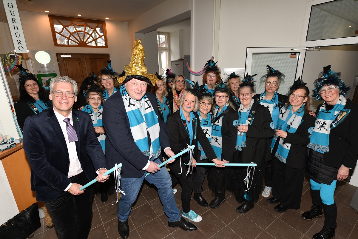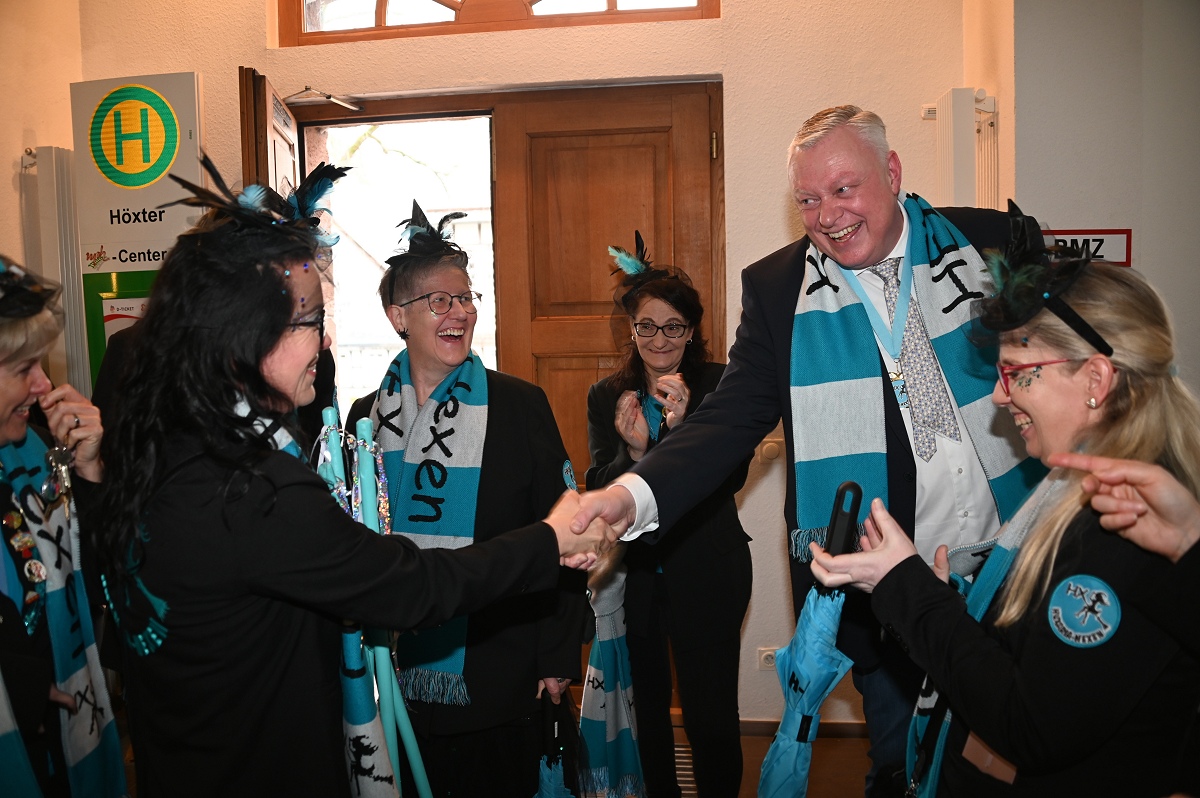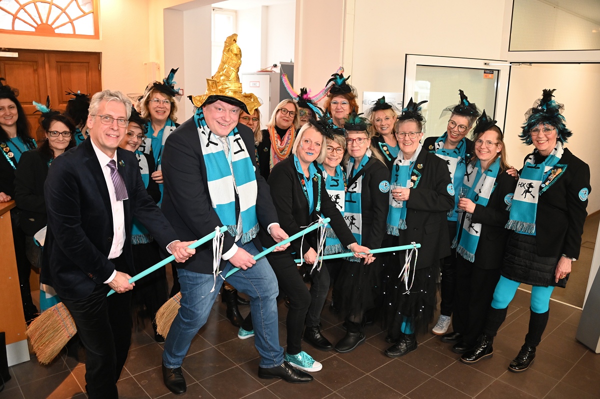 Höxter (TKu). Pünktlich um 11:11 Uhr landete an Weiberkarneval eine große Gruppe der Huxaria-Hexen mit ihren Besen am Höxteraner Stadthaus. Ziel der närrischen Invasion war es, ganz traditionsgemäß, den Rathausschlüssel in die Hände der Huxaria-Hexen zu bringen. Wie in jedem Jahr kam es dabei zu einem symbolischen Ringen mit Bürgermeister Daniel Hartmann sowie den Dezernatsleitern Julia Gogrewe und Stefan Fellmann. Trotz Gegenwehr musste die Stadtspitze letztlich kapitulieren: Der Schlüssel ging an die Huxaria-Hexen, die damit offiziell die närrische Regentschaft übernahmen. Als sichtbares Zeichen der Machtübernahme erhielt Bürgermeister Hartmann zudem einen goldenen Hexenhut, den er unter dem Jubel der Anwesenden aufgesetzt bekam. Nach der erfolgreichen Eroberung richtete Oberhexe Simone Kube das Wort an die Zuschauer. In gereimter Form nahmen die Hexen dabei die leeren Kassen, gestrichene Projekte und die kommunalpolitischen Herausforderungen humorvoll aufs Korn.