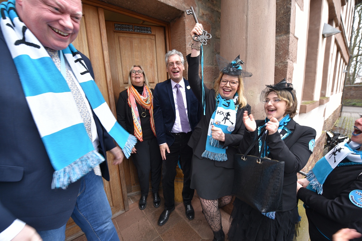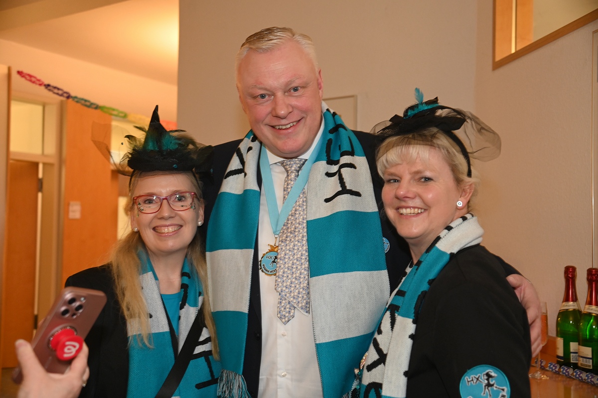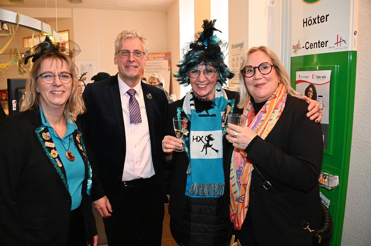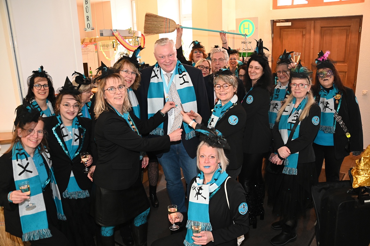 Höxter (TKu). Pünktlich um 11:11 Uhr landete an Weiberkarneval eine große Gruppe der Huxaria-Hexen mit ihren Besen am Höxteraner Stadthaus. Ziel der närrischen Invasion war es, ganz traditionsgemäß, den Rathausschlüssel in die Hände der Huxaria-Hexen zu bringen. Wie in jedem Jahr kam es dabei zu einem symbolischen Ringen mit Bürgermeister Daniel Hartmann sowie den Dezernatsleitern Julia Gogrewe und Stefan Fellmann. Trotz Gegenwehr musste die Stadtspitze letztlich kapitulieren: Der Schlüssel ging an die Huxaria-Hexen, die damit offiziell die närrische Regentschaft übernahmen. Als sichtbares Zeichen der Machtübernahme erhielt Bürgermeister Hartmann zudem einen goldenen Hexenhut, den er unter dem Jubel der Anwesenden aufgesetzt bekam. Nach der erfolgreichen Eroberung richtete Oberhexe Simone Kube das Wort an die Zuschauer. In gereimter Form nahmen die Hexen dabei die leeren Kassen, gestrichene Projekte und die kommunalpolitischen Herausforderungen humorvoll aufs Korn.