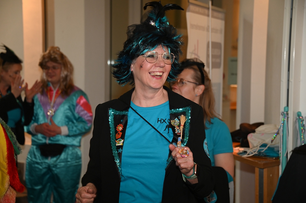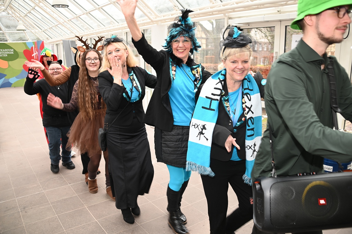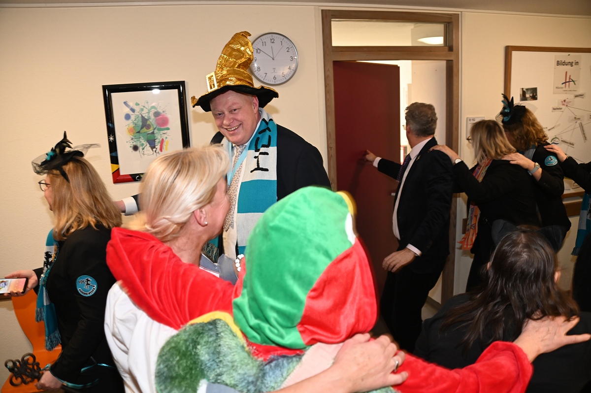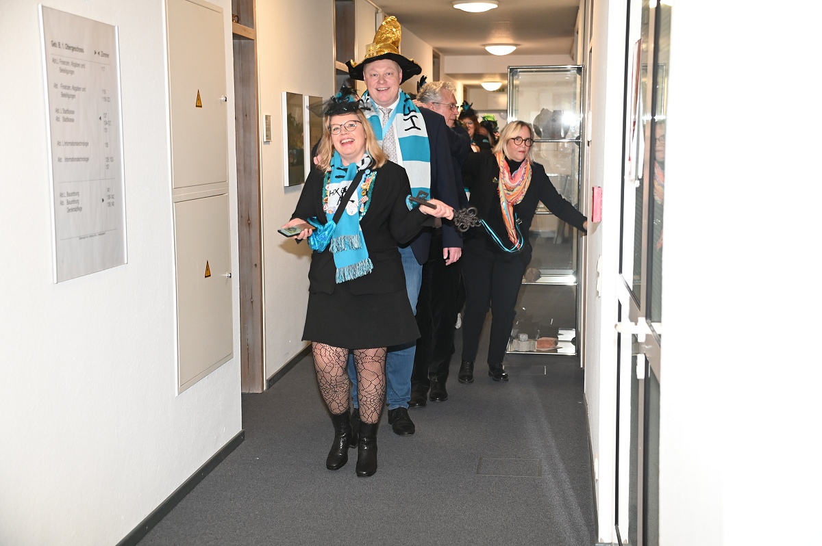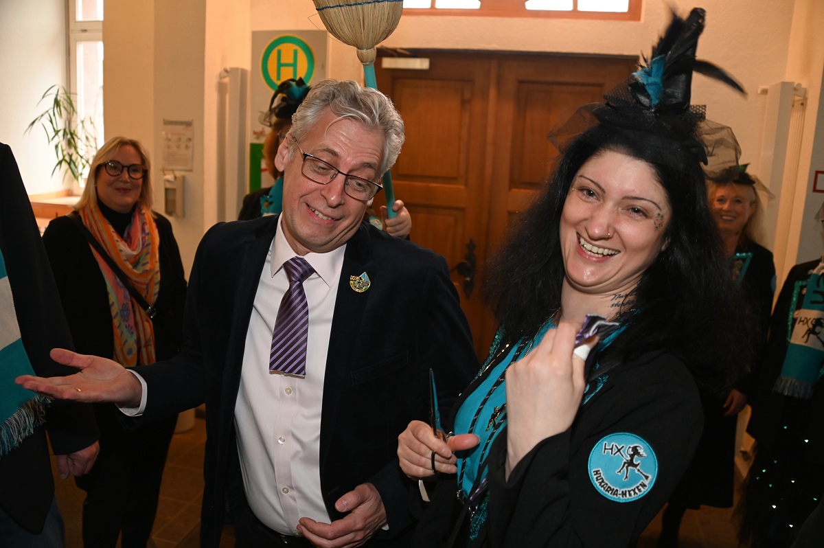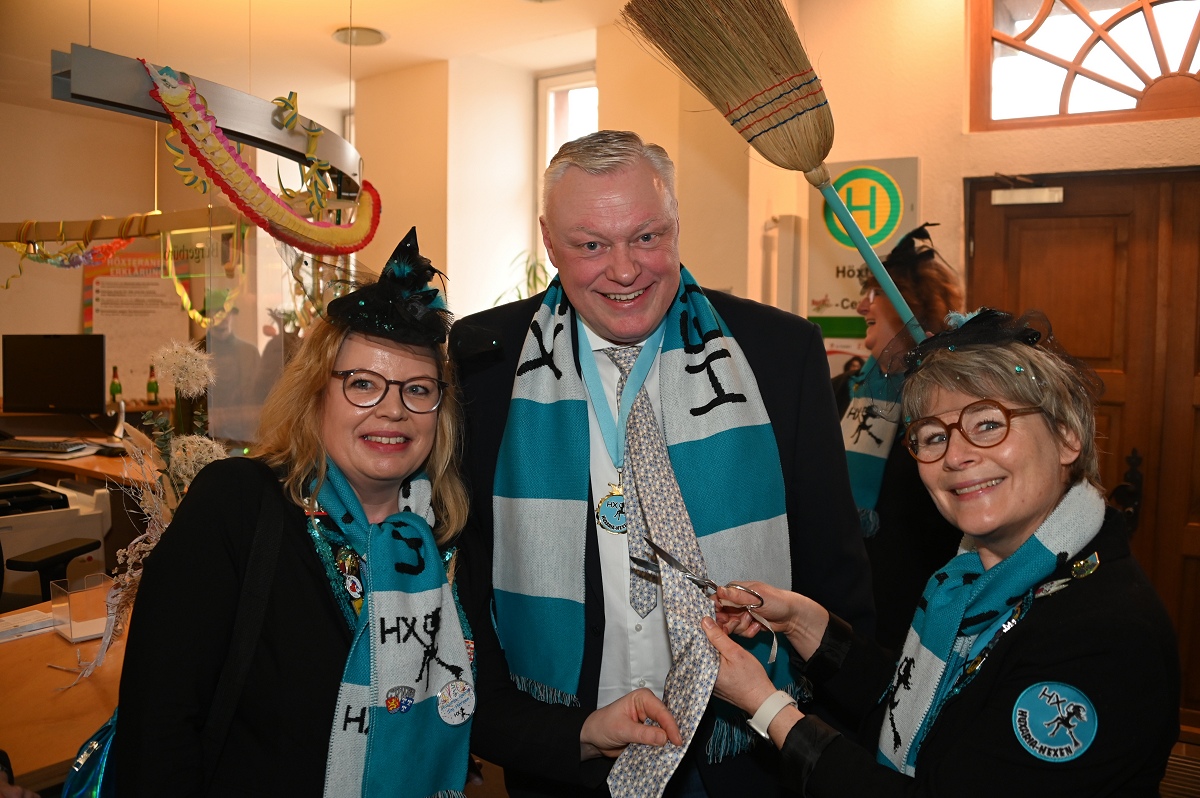 Gleichzeitig riefen sie dazu auf, den Alltag für einen Moment hinter sich zu lassen und die fünfte Jahreszeit mit Freude, Spaß und einem guten Schluck zu feiern. Begleitet wurde die Rede von einem dreifachen „Höxter, Hex, Hex“ und einem närrischen Gruß an den Bürgermeister. Natürlich durfte auch der traditionelle Krawattenbrauch nicht fehlen: „Schnipp, schnapp“ hieß es für Bürgermeister Daniel Hartmann und Dezernent Stefan Fellmann, deren Krawatten fachgerecht gekürzt wurden. Baudezernentin Julia Gogrewe blieb davon verschont und erhielt stattdessen einen Pin der Huxaria-Hexen für ihr Jackett. Zum Abschluss zogen die Hexen zusammen mit den städtischen Würdenträgern und einigen Mitarbeitenden der Stadtverwaltung mit einer große Polonäse fröhlich durch die Flure des Stadthauses.