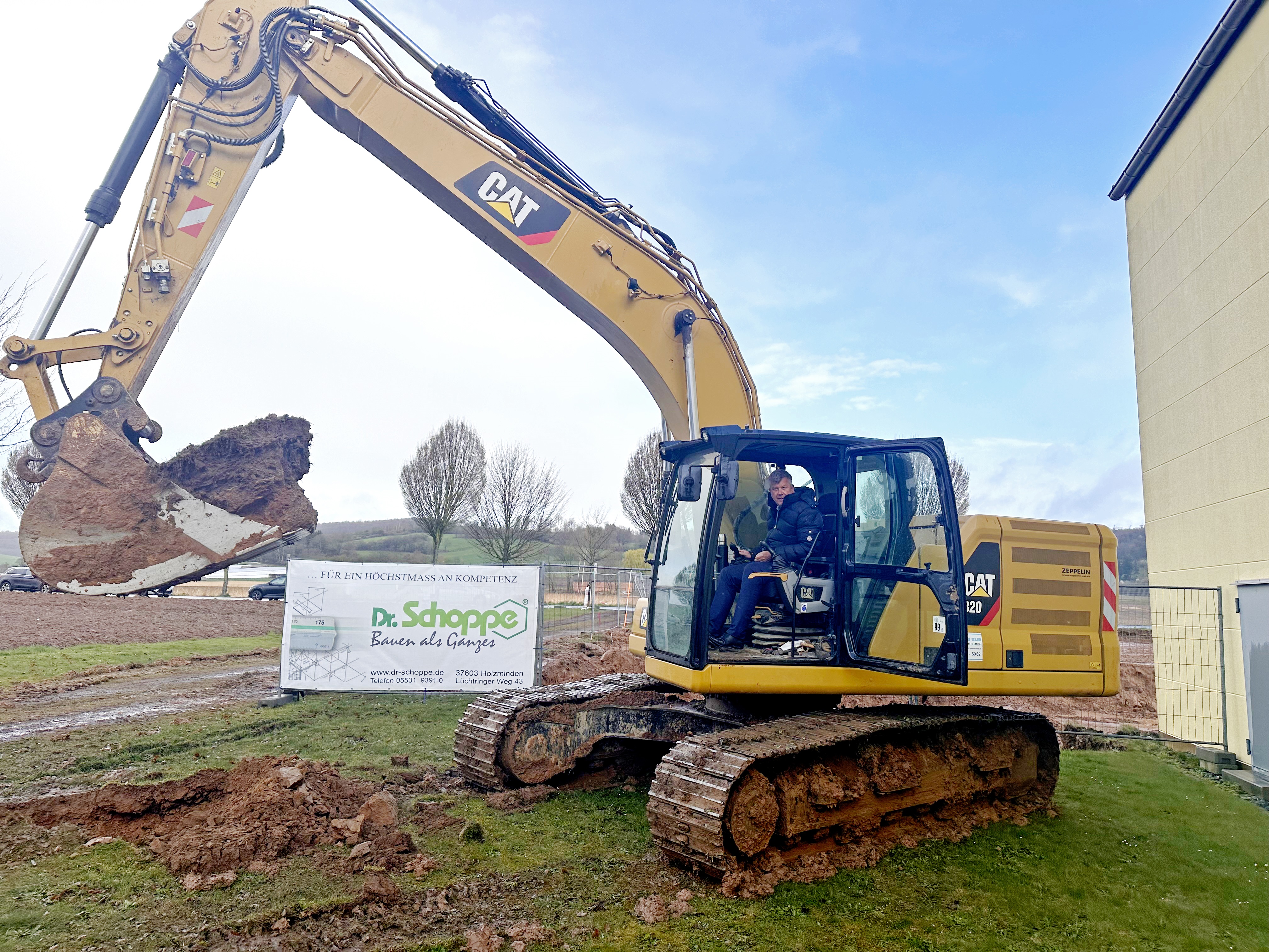 Ein besonderer Moment: Geschäftsführer Ralf Streicher nahm selbst im Bagger Platz und führte den ersten Aushub durch – unterstützt von den Projektbeteiligten, die den Baubeginn mit Spaten und Schutzhelmen begleiteten.