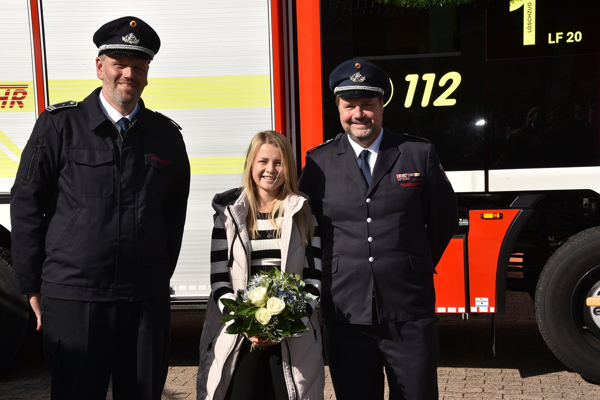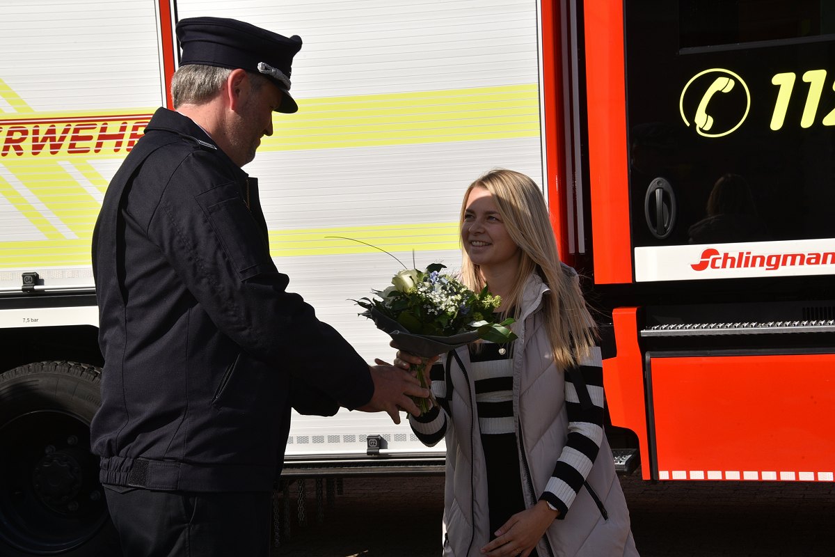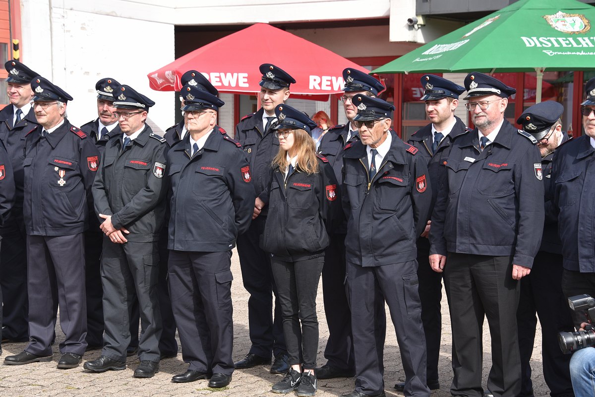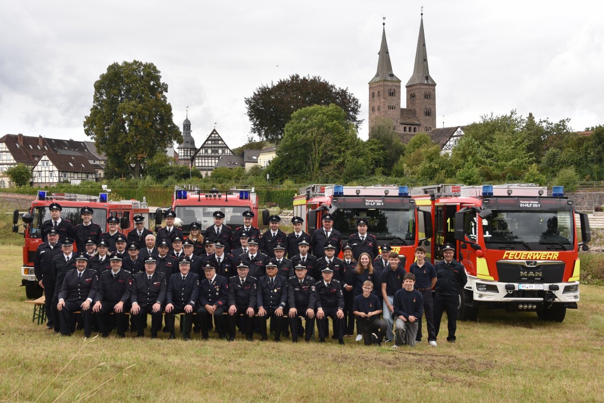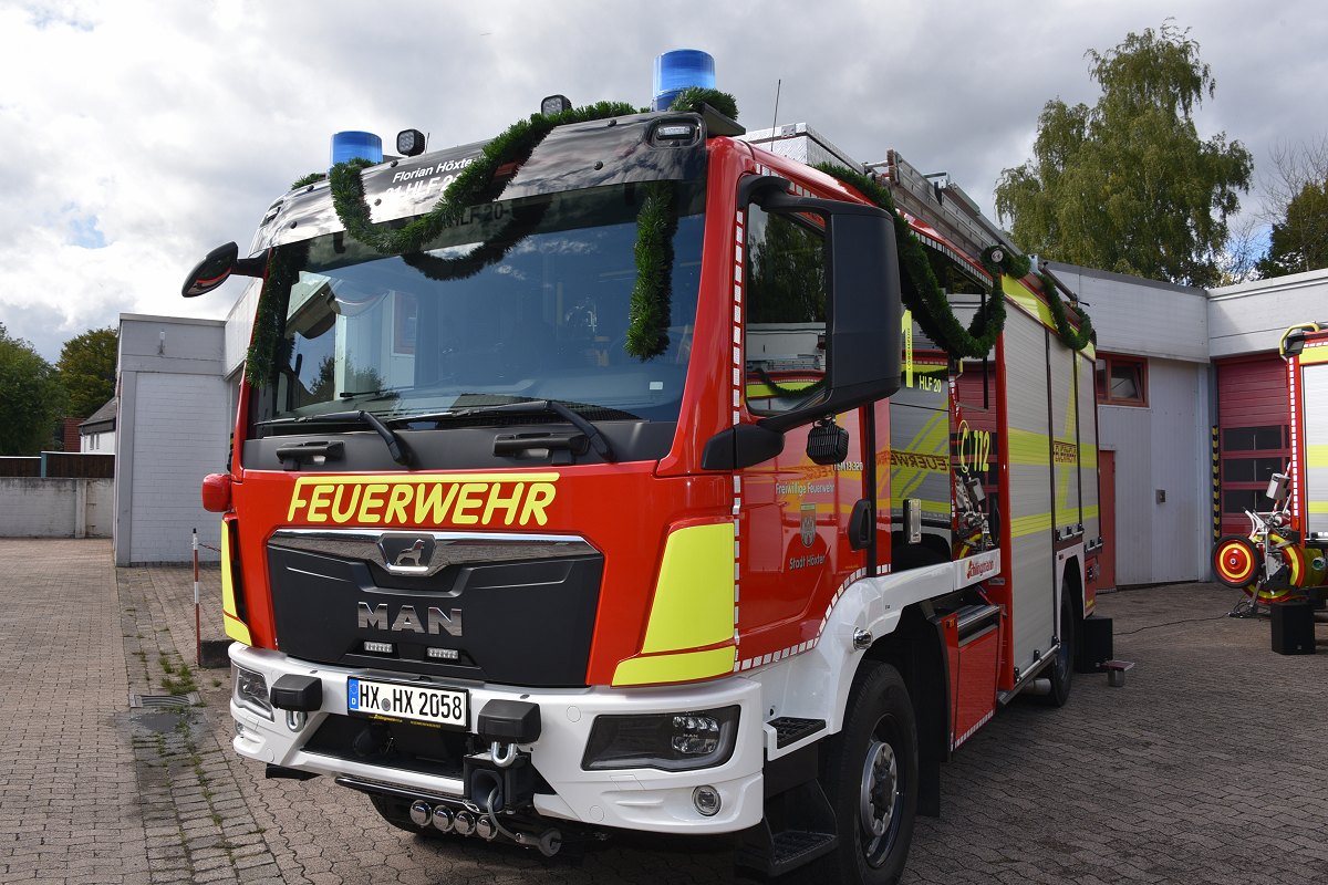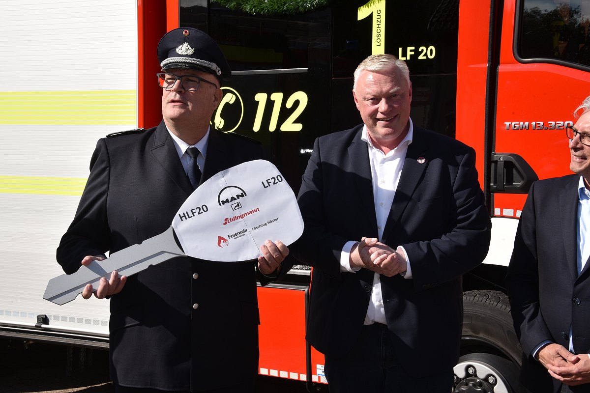 Höxter (TKu). Übergabe der neuen „Feuerwehr-Zwillinge“: Am vergangenen Samstag fand die feierliche Übergabe zweier neuer Einsatzfahrzeuge statt. Mit einem Hilfeleistungslöschfahrzeug (HLF 20) und einem Löschgruppenfahrzeug (LF 20) verstärkt die Feuerwehr Höxter ihre Schlagkraft und löst gleichzeitig zwei in die Jahre gekommene Fahrzeuge aus den 1990er-Jahren ab. Bevor die offiziellen Ansprachen begannen, nutzten die Kameradinnen und Kameraden des Löschzugs die Gelegenheit für ein Erinnerungs-Gruppenfoto. Bei der feierlichen Übergabe überreichte Bürgermeister Daniel Hartmann symbolisch den übergroßen Fahrzeugschlüssel an Wehrleiter Jürgen Schmits, der diesen an Löschzugführer Steven Noble und seinen Stellvertreter Christoph Tegethoff weitergab.