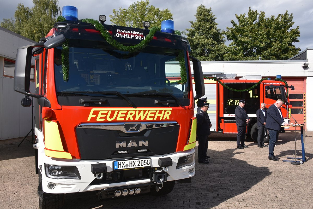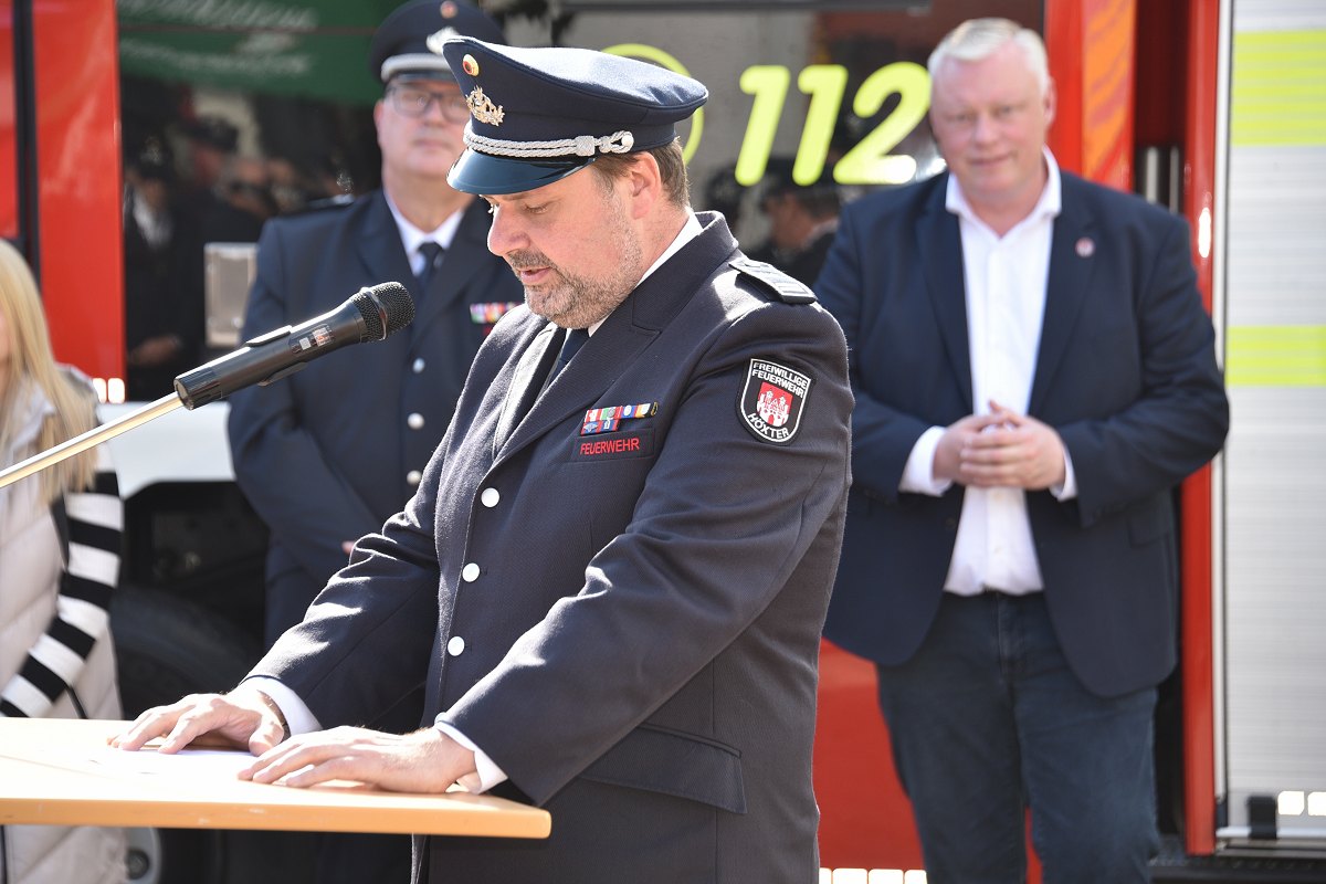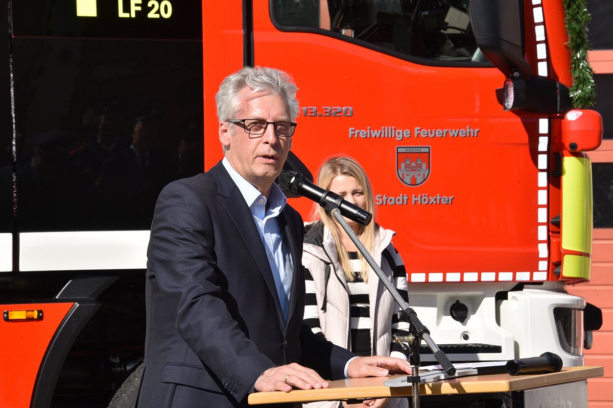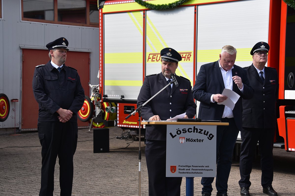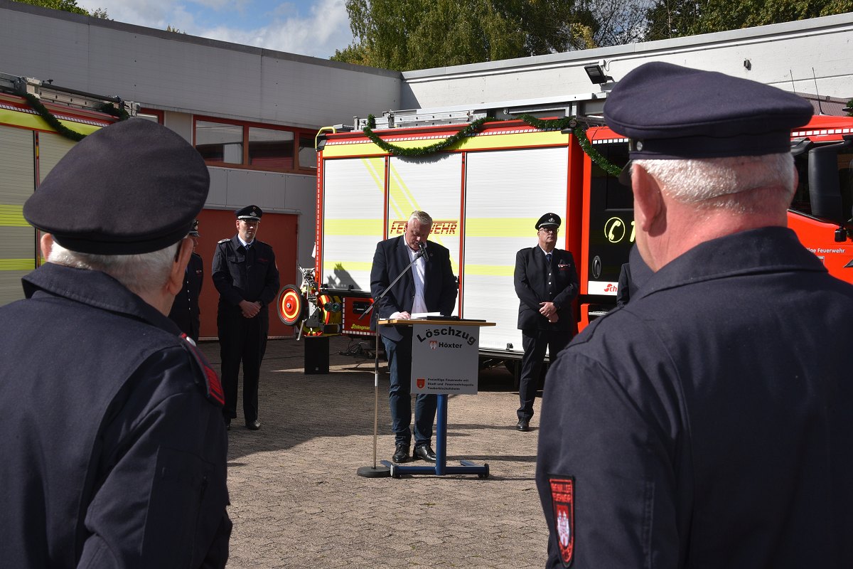 In seiner Ansprache zeigte sich Bürgermeister Hartmann begeistert: „Wenn zwei neue, blitzblanke Feuerwehrfahrzeuge auf den Hof rollen, dann schlägt nicht nur das Herz der Feuerwehr höher, sondern auch meins.“ Er erinnerte an die Ankunft der Fahrzeuge Ende August, die mit einer Wasserfontäne und Spalier der Kameraden wie ein „Ehrenempfang für zwei Rockstars“ inszeniert worden sei. Die beiden neuen Fahrzeuge ersetzen ein Tanklöschfahrzeug aus dem Jahr 1995 und ein Hilfeleistungslöschfahrzeug von 1999. „28 und 26 Jahre haben die beiden auf dem Buckel. Sie haben zuverlässig ihren Dienst getan, doch irgendwann ist der Punkt erreicht, an dem man Danke sagt und sie in den wohlverdienten Ruhestand schickt“, so Hartmann. Die Anschaffung sei eine große Investition für die Stadt: Rund 961.000 Euro kosteten Fahrgestell und Aufbau, weitere 165.000 Euro wurden für die umfangreiche Beladung aufgewendet. Besonders dankte Hartmann der Firma Fricke Spedition, die die Beladung kostenlos über anderthalb Jahre einlagerte. Insgesamt flossen damit über 1,1 Millionen Euro in die Sicherheit der Bürgerinnen und Bürger von Höxter. Jeder Cent sei gut investiert, betonte der Bürgermeister.