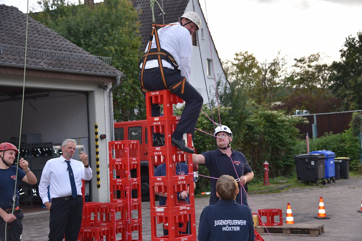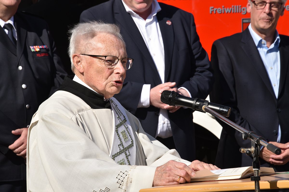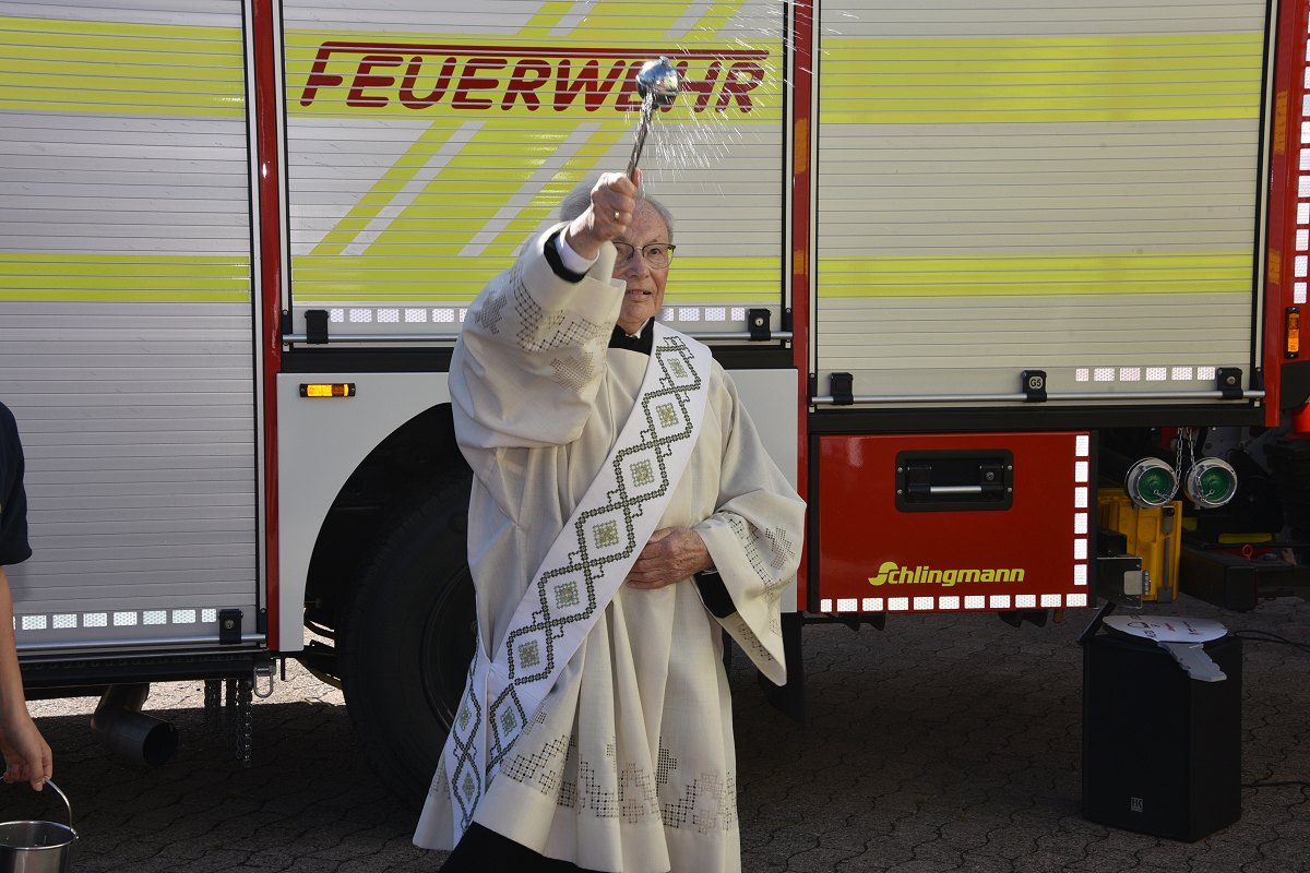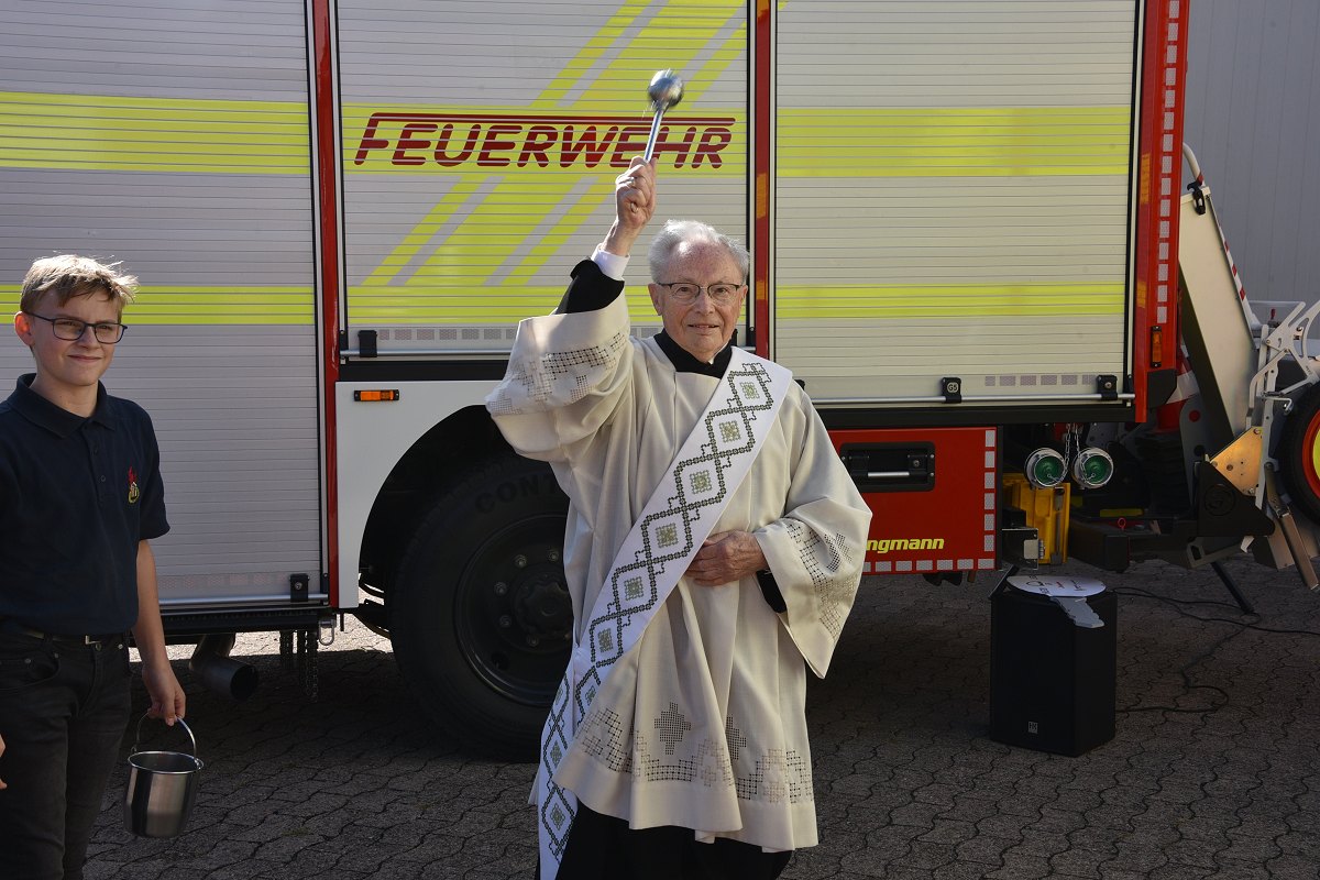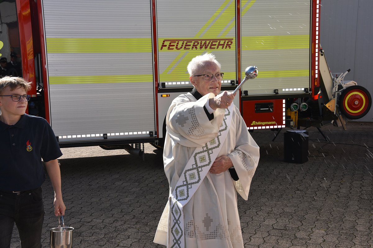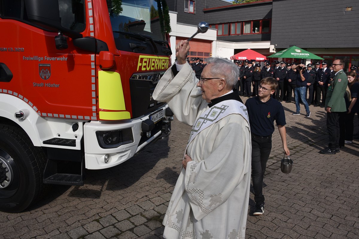 Auch Löschzugführer Steven Noble hob in seiner Rede die Bedeutung der beiden „Zwillinge“ hervor. Die bisherigen Einsatzfahrzeuge hätten Generationen von Feuerwehrleuten geprägt, doch die Einsatzrealität habe sich in den letzten 25 bis 30 Jahren stark verändert. „Mit den neuen Fahrzeugen gewinnen wir mehr als nur Technik“, erklärte Noble. Das HLF 20 verfüge über modernste Pumpensysteme und eine umfangreiche Ausstattung für technische Hilfeleistungen. Gemeinsam mit dem baugleichen Löschfahrzeug LF 20 mit 200 Litern mehr Löschwasser an Bord, also 2200 Liter, bilde es ein schlagkräftiges Duo. „Ein großer Vorteil ist, dass beide Fahrzeuge nahezu identisch aufgebaut sind. Das erleichtert uns den Umgang im Einsatz erheblich“, so der Löschzugführer. Zugleich erinnerte er daran, dass neue Technik auch neue Aufgaben mit sich bringe: intensive Schulungen, angepasste Abläufe und veränderte Gewohnheiten. Doch der Löschzug sei bereit, diese Herausforderung anzunehmen, so Noble. Mit der Übergabe der beiden Fahrzeuge setze die Stadt Höxter ein starkes Zeichen, betonte Noble: „Wir sehen hier nicht nur zwei neue Fahrzeuge. Wir sehen die Bereitschaft unserer Stadt, in Sicherheit zu investieren, und den Beweis, dass Engagement und Ehrenamt Wertschätzung erfahren.“ Im Anschluss segnete Diakon Erwin Winkler aus Lüchtringen die neue Technik mit Weihwasser. Die christliche Weihung der Fahrzeuge sollte aber weniger der Technik, sondern den Feuerwehrleuten dienen, die diese Geräte ab sofort bedienen müssen. Im Anschluss wurde die Übergabe beider Fahrzeuge noch mit einem Sommerfest mit Spiel und Spaß wie Kistenstapeln oder „Feuerwehr-Jenga“ gefeiert.