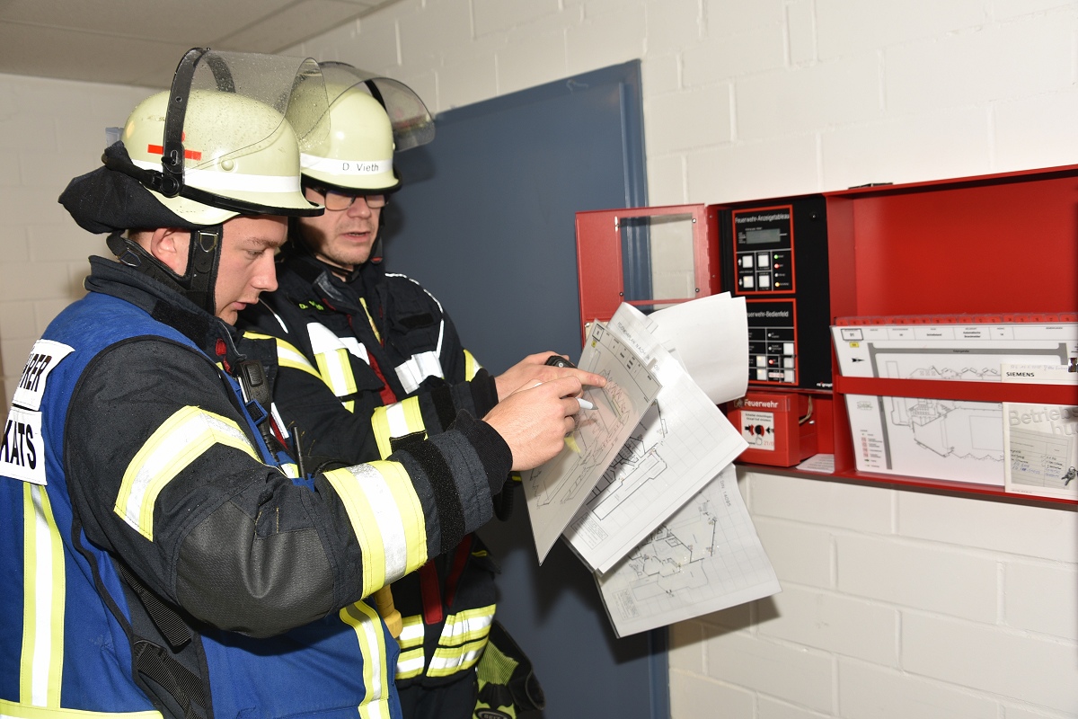 Die Übung war in vier Szenarien gegliedert, die an unterschiedlichen Orten in Beverungen und Dalhausen stattfanden. Bei einer Übung im Industriegebiet Beverungen mussten die Einsatzkräfte ein Kind retten, das unter einem Pkw eingeklemmt war. Da passendes technisches Gerät nicht verfügbar war, stand die Feuerwehr vor einer kniffligen Aufgabe und musste mit dem vorhandenen Material improvisieren. Parallel kümmerte sich der Rettungsdienst um die Versorgung des kleinen Patienten. „Für sie eine besondere Herausforderung, da Medikamente bei Kindern exakt nach Körpergewicht dosiert werden müssen“, sagt der Feuerwehr-Ausbilder und Notfallsanitäter Jan Nolte, der für dieses Szenario verantwortlich war und auch seine Kinder Lennart (10) und Jonathan (7) als vom Einsatz betroffene Kinder eingebunden hat. Ein weiteres Szenario führte die Kräfte in die verwinkelten Versorgungsgänge der Stadthalle Beverungen, in dem eine Brandmeldeanlage ausgelöst hatte. Die Ursache: Ein Brand mit einer starken Verrauchung in einem Technikraum. „Unbekannte Fluchtwege und die Orientierung über Feuerwehrpläne machten die Lage anspruchsvoll“, erklärte Alexander Bönning. Während die Feuerwehr im Inneren tätig war, blieb der Rettungsdienst in Bereitschaft und musste nachher doch noch einen kleinen Patienten mit einer Rauchgasvergiftung behandeln.