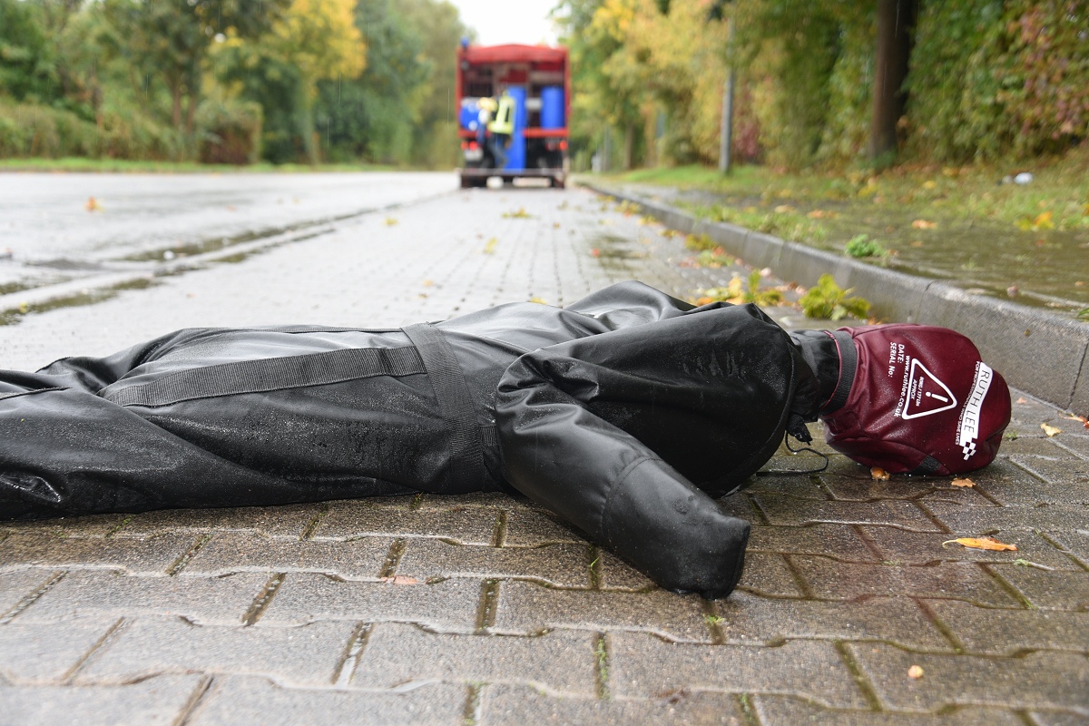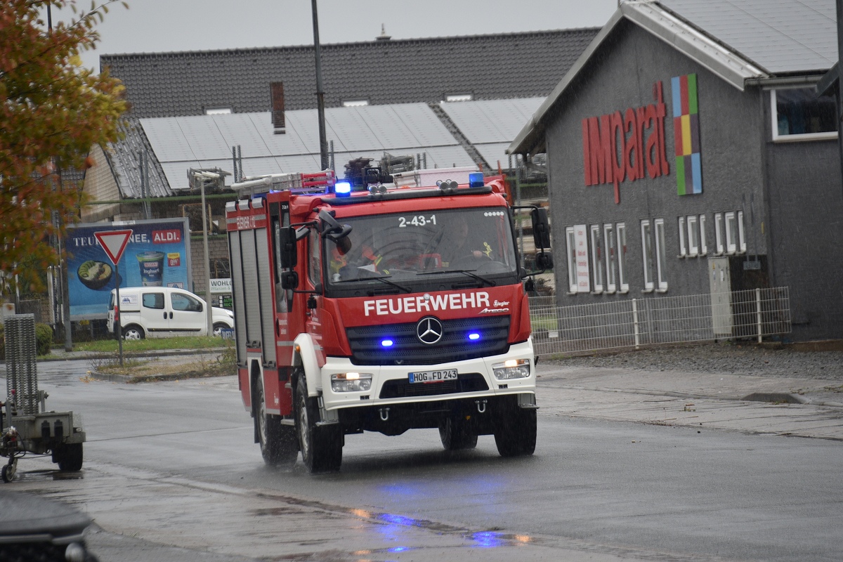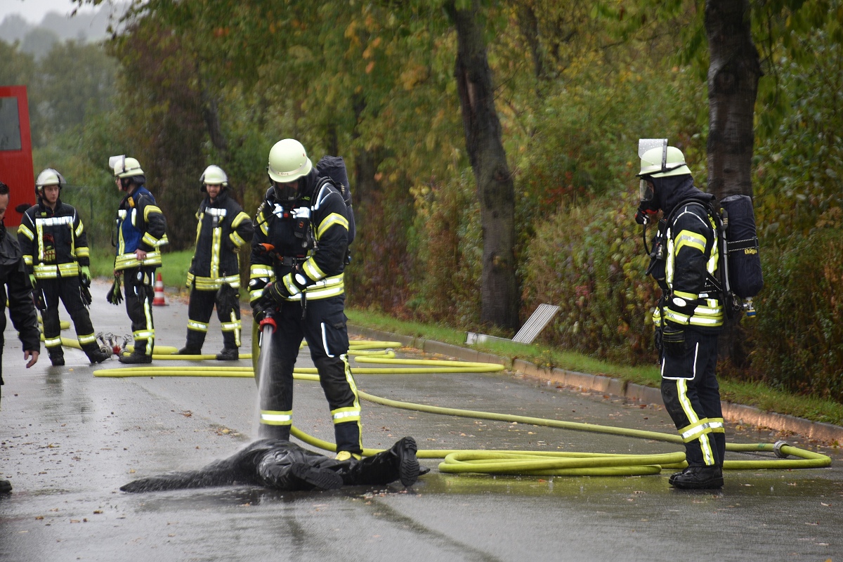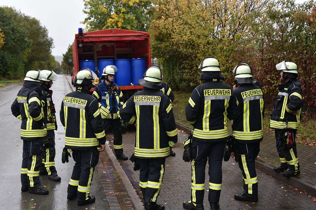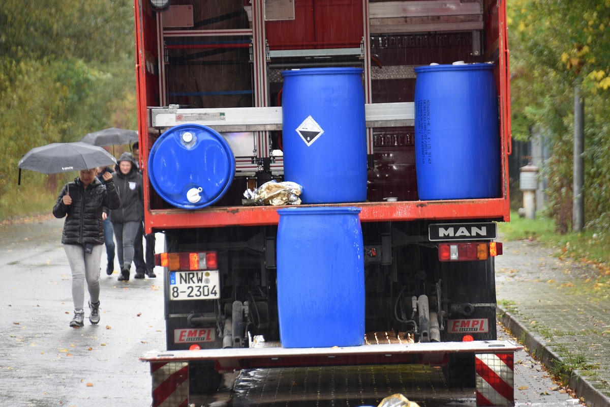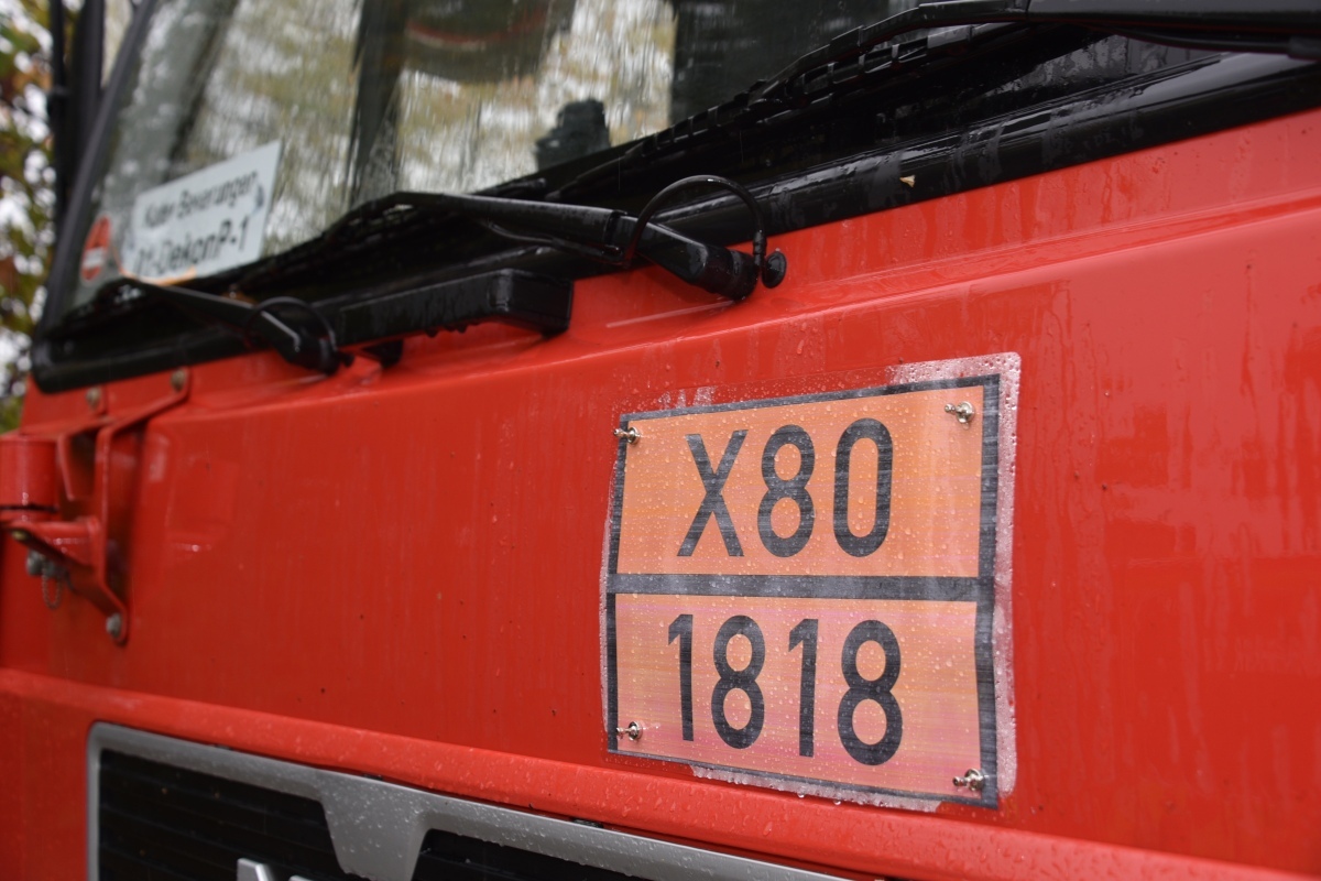 Gefährlich wurde es am Weseranger, wo ein Lkw mit Gefahrgutkennzeichnung Flüssigkeiten verlor. Hier galt es, die Lage nach dem sogenannten „GAMS-Schema“ abzuarbeiten, sprich die Gefahr erkennen, absperren, Menschenrettung einleiten und Spezialkräfte nachfordern. Die Feuerwehr rettete zwei Personen unter Atemschutz und zog sich danach wieder schnell zurück. Wichtig war unter anderem zu erkennen, dass dieser Stoff nicht mit Wasser in Berührung kommen darf, was auf der Warntafel an dem Gefahrgut-Lkw das „X“ vor der Gefahrzahl bedeute, erklärt der Pressesprecher. Bei dem ausgetretenen Stoff sollte es sich um Siliciumtetrachlorid handeln, eine farblose Flüssigkeit mit erstickendem Geruch, die in Gegenwart von Feuchtigkeit die meisten Metalle stark angreift und bei Kontakt mit Wasser heftig reagiert, wobei das ätzende Gas Chlorwasserstoff freigesetzt wird.