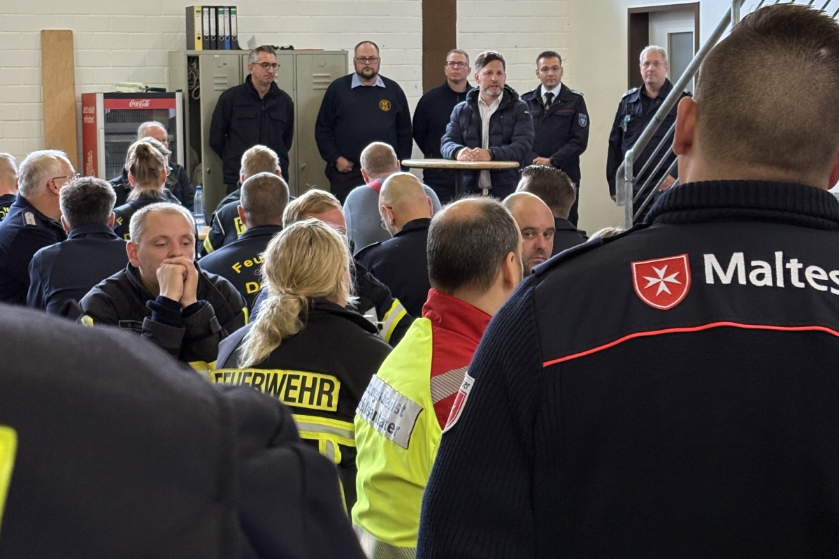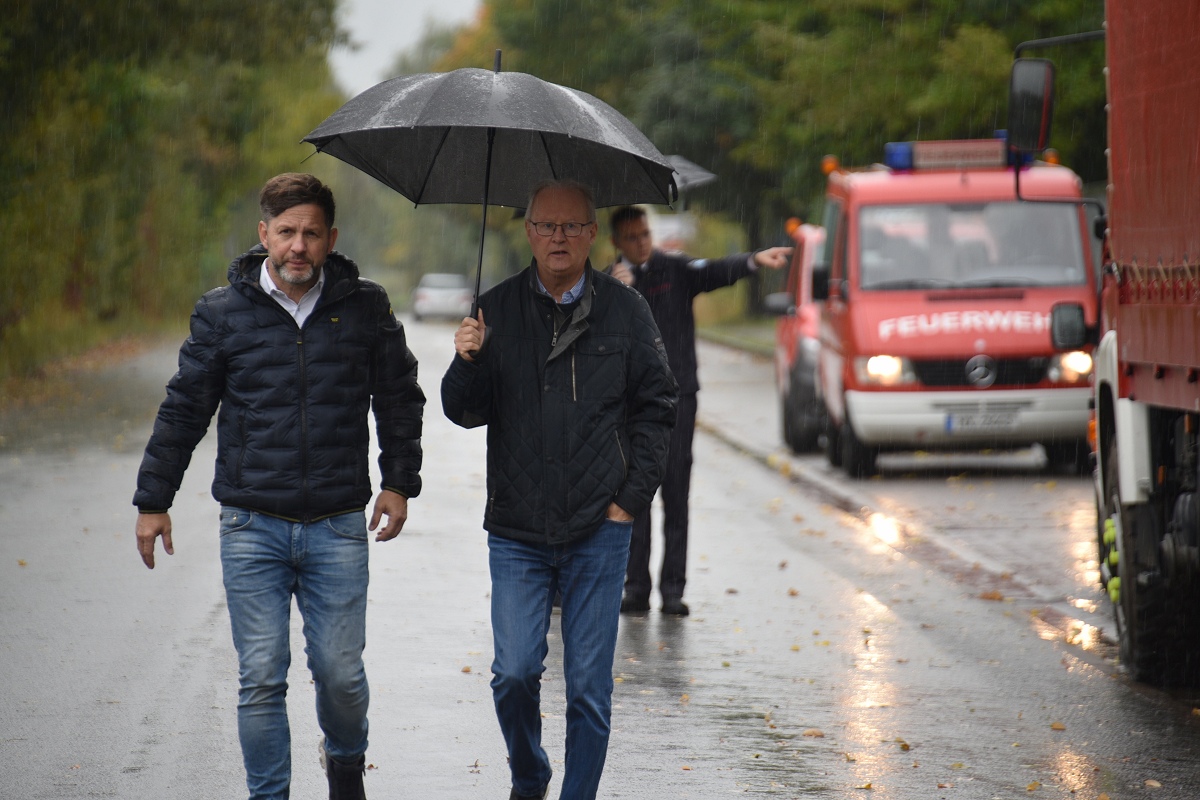 Beim vierten Fall ging es in die Verbundschule nach Dalhausen, wo ein Elektriker einen Stromschlag erlitten hatte. Dunkle Flure ohne Beleuchtung und ein unklarer Zugang erschwerten den Einsatz. Feuerwehrkräfte verschafften dem Rettungsdienst den Weg und unterstützten bei der Rettung des schwer verletzten Patienten, während dieser parallel notfallmedizinisch versorgt wurde. Begleitet wurden die Übungen von den Bürgermeistern der beteiligten Städte. Sie zogen von Station zu Station, informierten sich über die Abläufe und dankten den Einsatzkräften für ihr Engagement. Trotz Sturm und Dauerregen, die den Tag zusätzlich erschwerten, lobten sie zusammen mit dem Leiter der Feuerwehr Beverungen, Sebastian Ewen, die Professionalität und die gute Zusammenarbeit aller Teams.