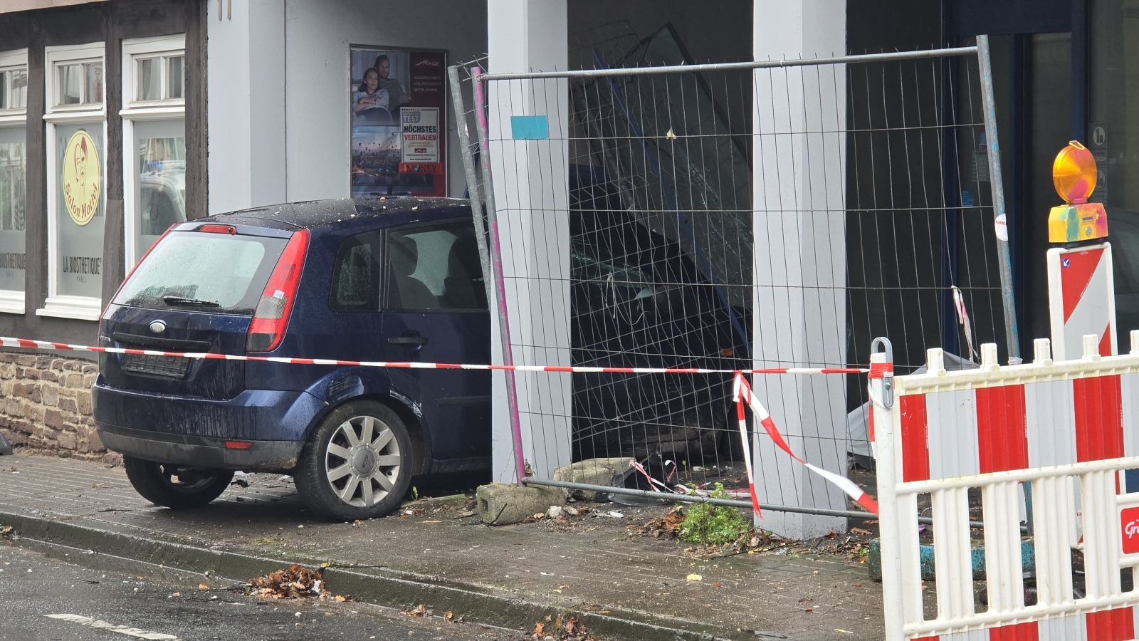 Höxter (TKu). Am Montagnachmittag steckte das Unfallfahrzeug noch immer im Ladengeschäft in der Westerbachstraße in Höxter neben einem Döner-Geschäft: Der spektakuläre Unfall, der am Sonntag gegen 17 Uhr in der Westerbachstraße für großen Schrecken gesorgt hat, zieht nun umfangreiche Arbeiten mit sich. Der Ford Fiesta, der nach bisherigen Erkenntnissen offenbar Startschwierigkeiten hatte und mit einer Überbrückungshilfe letztendlich doch ansprang, schoss am Sonntag mit der 22-jährigen Fahrerin geradeaus nach vorn, über den Gehweg und die Westerbachstraße hinweg bis in die Schaufensterfront des gegenüberliegenden Hauses. Dabei beschädigte das Fahrzeug auch ein vor dem Gebäude errichtetes Gerüst so stark, dass Einsturzgefahr bestand. Am Montagmorgen rückte die zuständige Gerüstbaufirma an, um die eigene Konstruktion vollständig abzubauen. Zunächst hatte es geheißen, dass das Gerüst stehen bleiben könne und die beschädigten Stützen ausgetauscht würden.