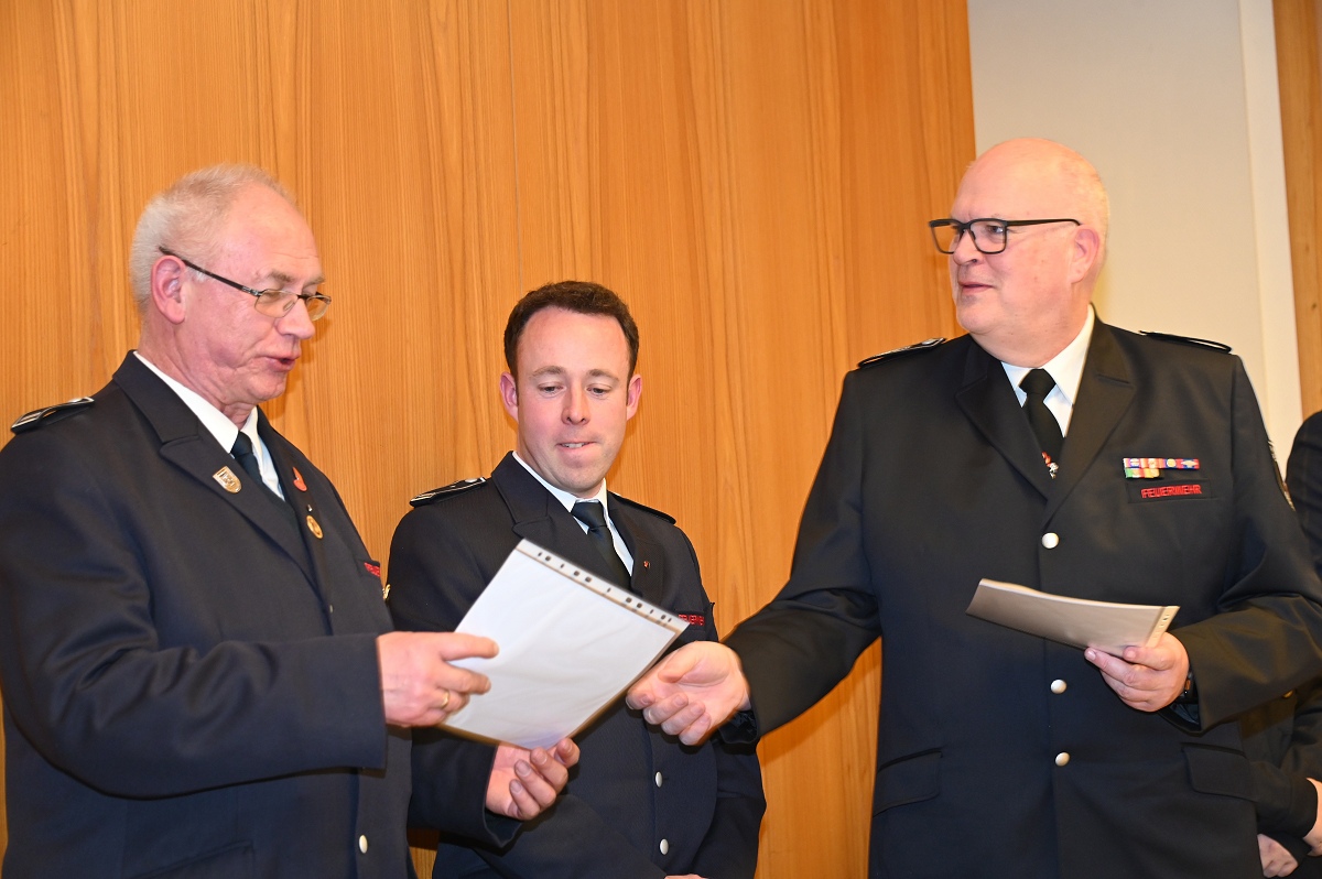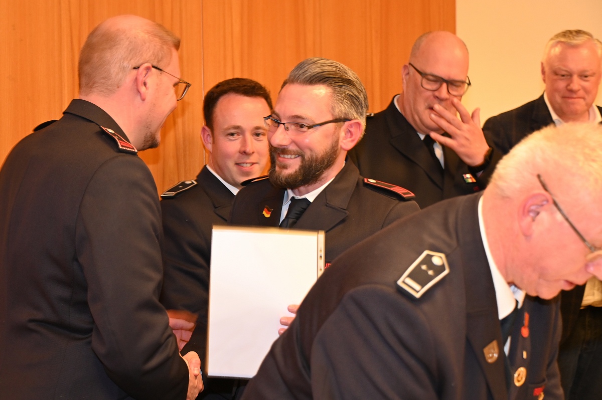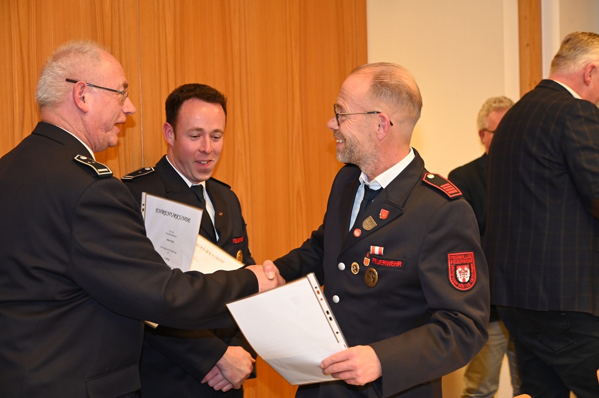 Eine besondere Ehrung wurde Hauptfeuerwehrmann Ludger Heine zuteil. Für seine 40-jährige aktive Mitgliedschaft in der Freiwilligen Feuerwehr verlieh Stadtbrandinspektor Jürgen Schmits ihm eine Urkunde sowie das Sonderabzeichen des Landesfeuerwehrverbandes. Sowohl der Leiter der Feuerwehr als auch Bürgermeister Daniel Hartmann dankten ihm für seinen jahrzehntelangen Einsatz. Aus gesundheitlichen Gründen trat Ludger Heine aus der ersten Reihe der aktiven Feuerwehrleute zurück und wurde in die Ehrenabteilung versetzt. Unter großem Applaus der Mannschaft verabschiedete ihn Jürgen Schmits mit einer Urkunde. Für ihre zehnjährige aktive Mitgliedschaft wurden Unterbrandmeister Timo Heine und Fabian Rosner in Abwesenheit sowie Hauptfeuerwehrmann Julian Jöhren und Unterbrandmeister Maximilien Meise ausgezeichnet. Urkunden für 20 Jahre aktive Mitgliedschaft überreichte Löschgruppenführer Andreas Bohnenpoll an Rudolf Lützer, Patrick Haller und Lukas Heine.