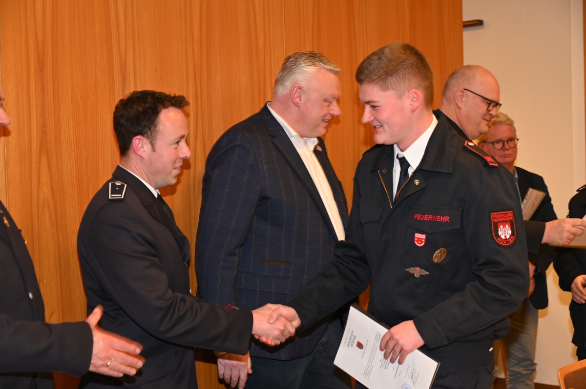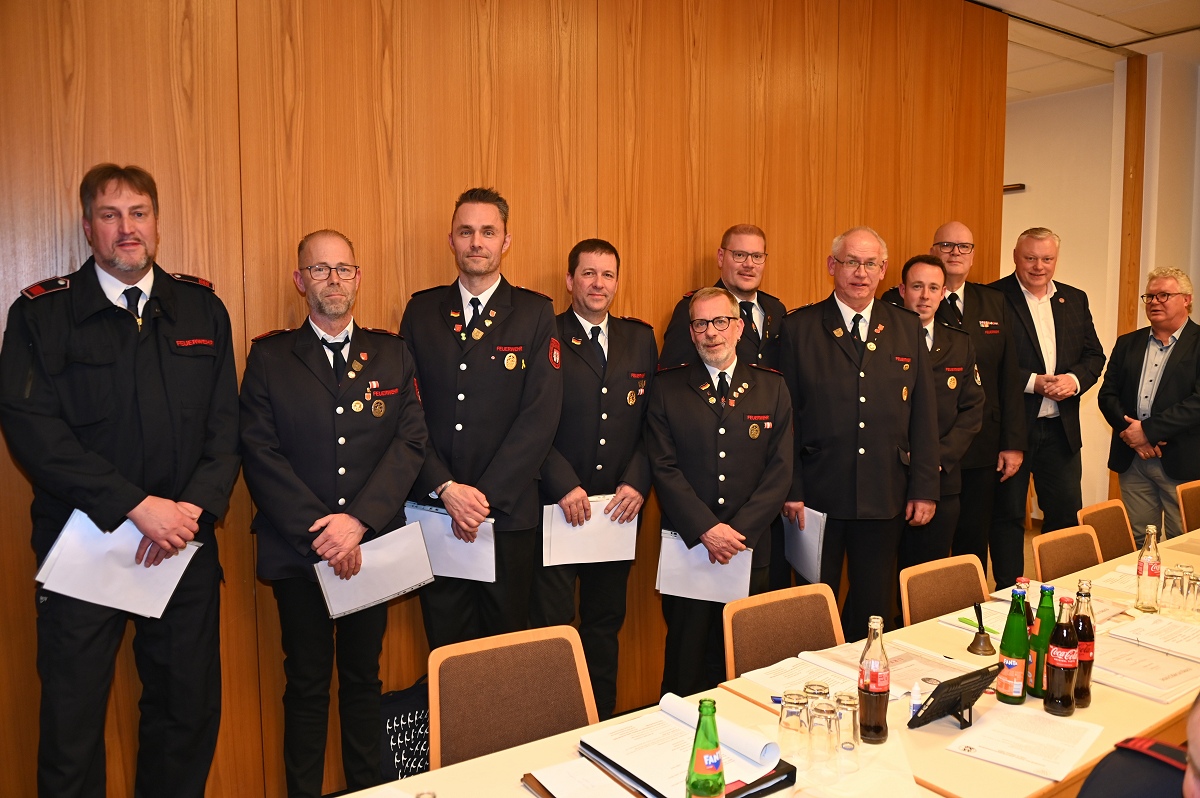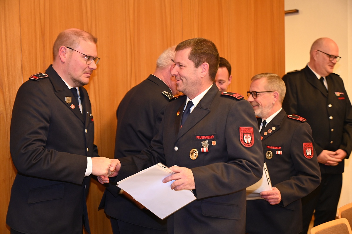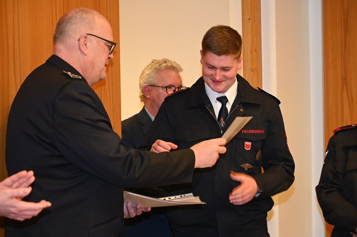 Eine besondere Ehrung wurde Hauptfeuerwehrmann Ludger Heine zuteil. Für seine 40-jährige aktive Mitgliedschaft in der Freiwilligen Feuerwehr verlieh Stadtbrandinspektor Jürgen Schmits ihm eine Urkunde sowie das Sonderabzeichen des Landesfeuerwehrverbandes. Sowohl der Leiter der Feuerwehr als auch Bürgermeister Daniel Hartmann dankten ihm für seinen jahrzehntelangen Einsatz. Aus gesundheitlichen Gründen trat Ludger Heine aus der ersten Reihe der aktiven Feuerwehrleute zurück und wurde in die Ehrenabteilung versetzt. Unter großem Applaus der Mannschaft verabschiedete ihn Jürgen Schmits mit einer Urkunde. Für ihre zehnjährige aktive Mitgliedschaft wurden Unterbrandmeister Timo Heine und Fabian Rosner in Abwesenheit sowie Hauptfeuerwehrmann Julian Jöhren und Unterbrandmeister Maximilien Meise ausgezeichnet. Urkunden für 20 Jahre aktive Mitgliedschaft überreichte Löschgruppenführer Andreas Bohnenpoll an Rudolf Lützer, Patrick Haller und Lukas Heine.