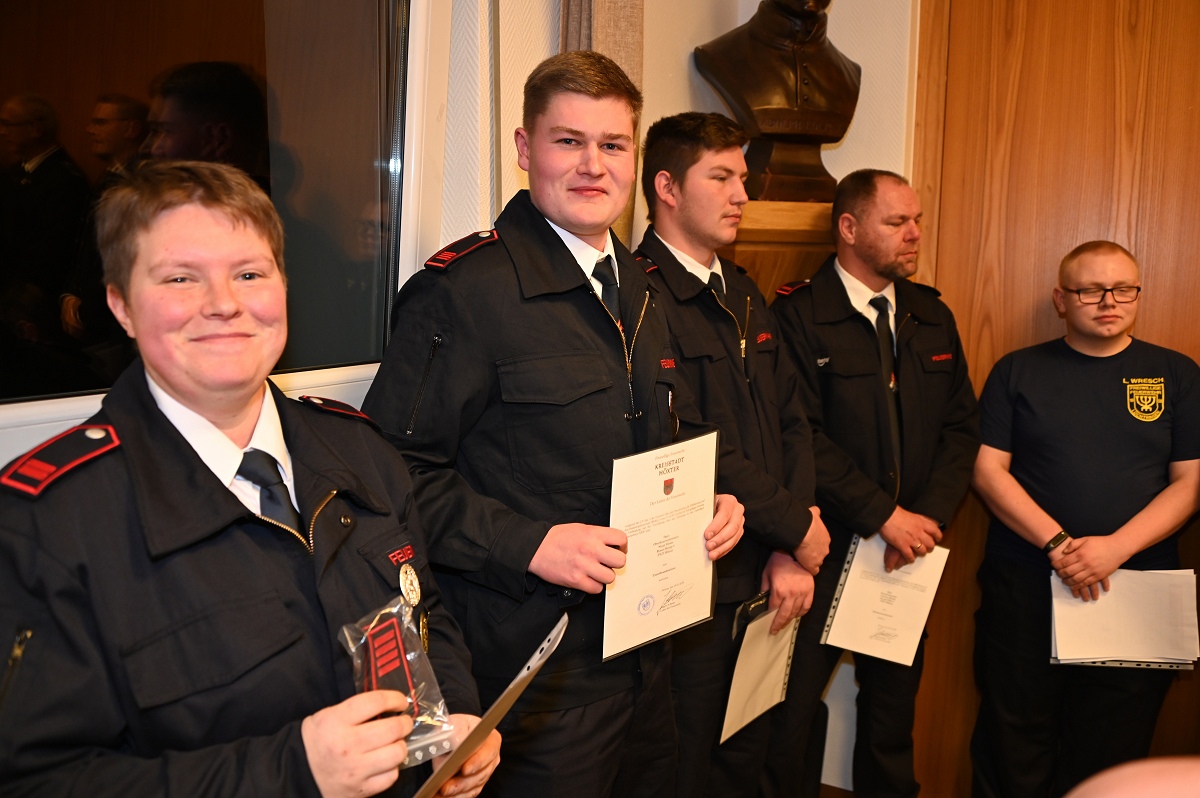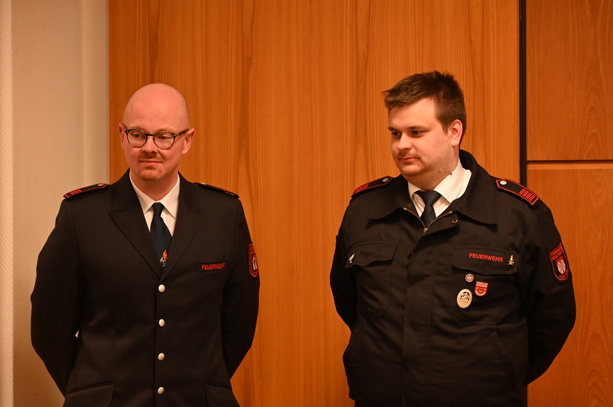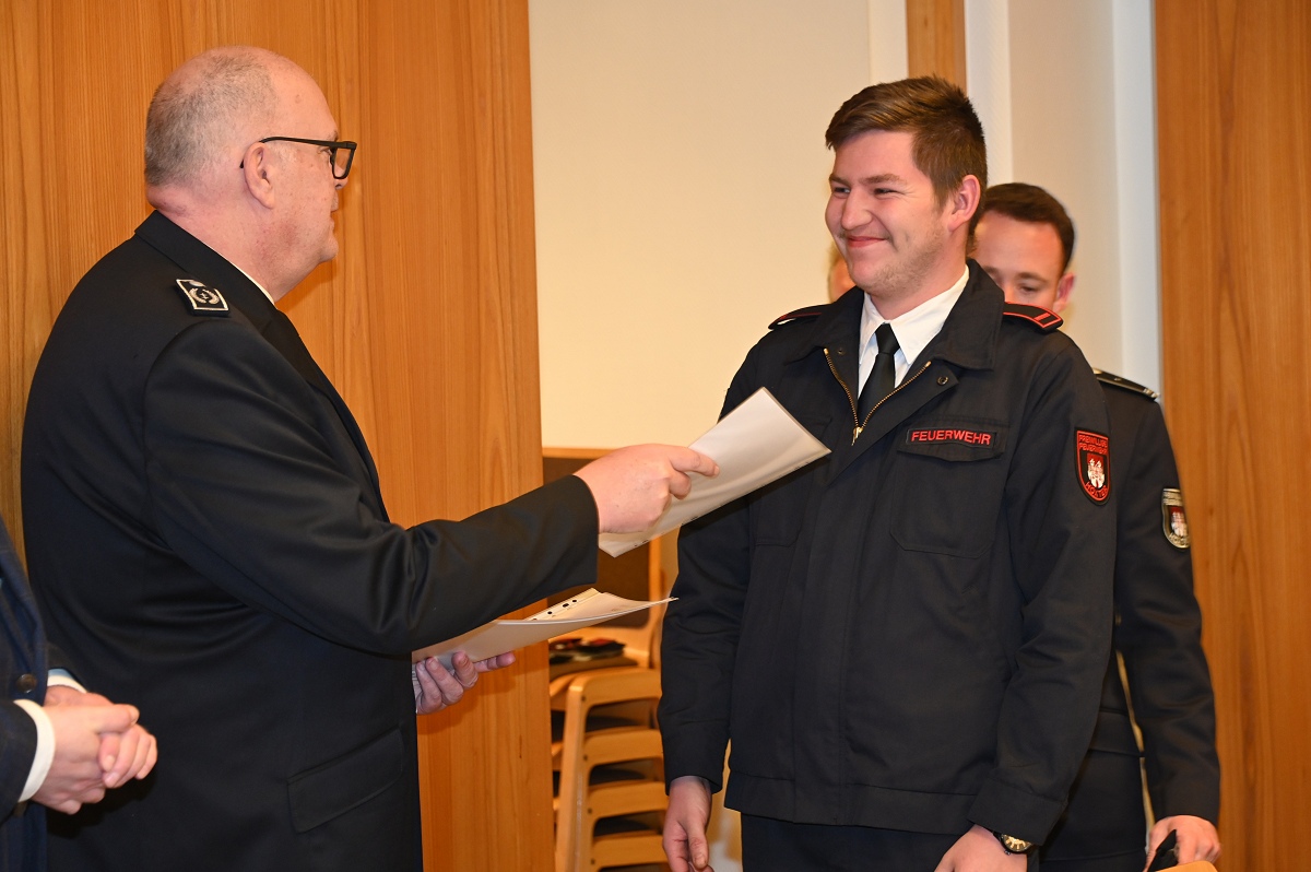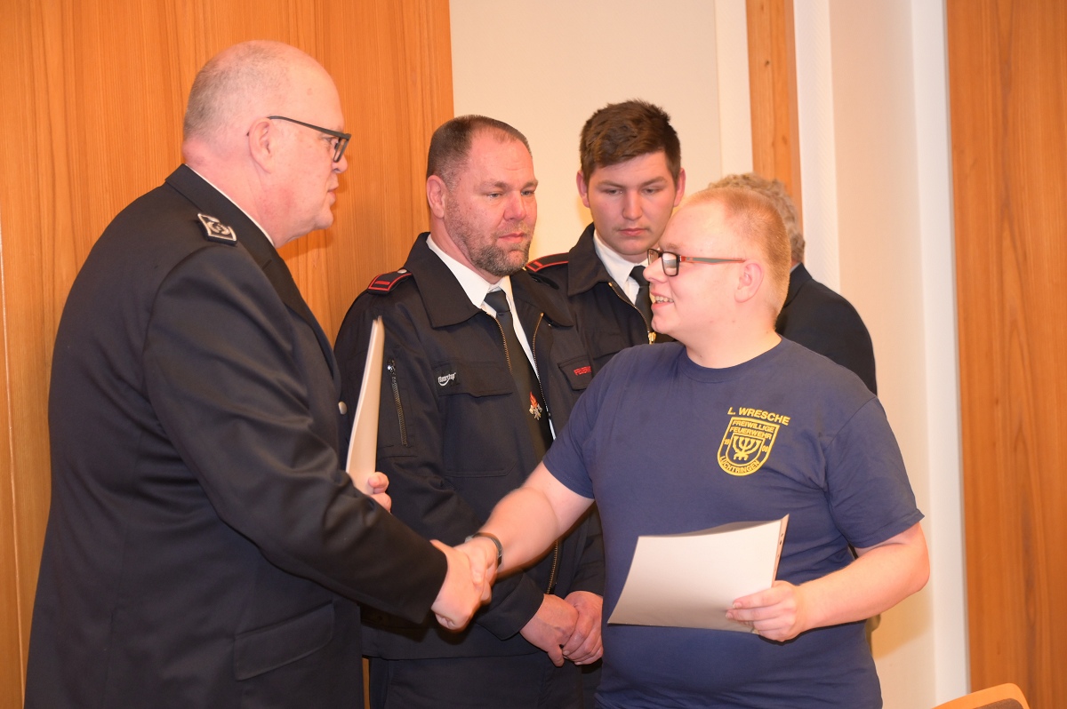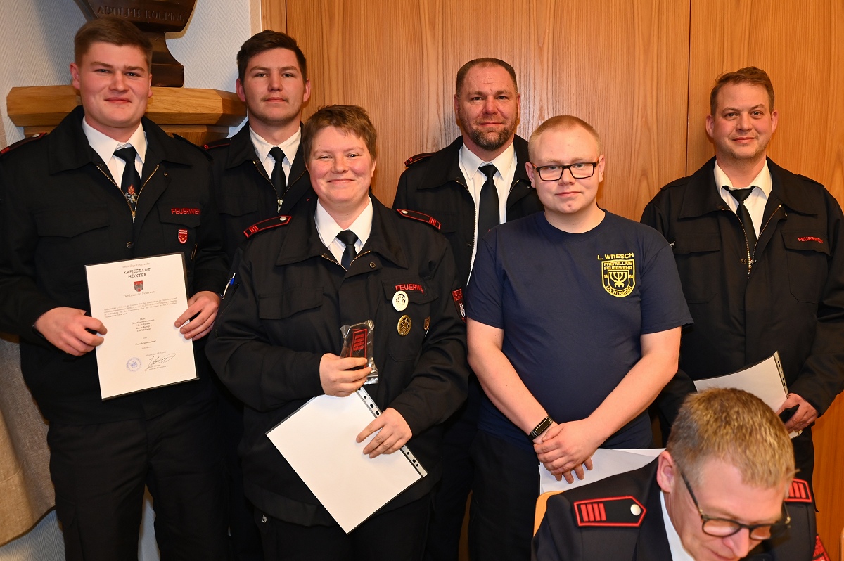Auch Beförderungen standen auf der Tagesordnung. Zum Unterbrandmeister wurden Anna Lena Becher, Benjamin Leiße und Noah Hesse befördert. Eine Beförderung zum Oberfeuerwehrmann erhielten Frederik Hamelmann und Carsten Olandt. Zum Feuerwehrmann ernannte Jürgen Schmits Ingo Wittkowski und Leon Wresche. Für die erfolgreiche 30. Teilnahme an Leistungswettkämpfen erhielt Wolfgang Oppermann das Leistungsabzeichen in Gold mit der Zahl 30. Das silberne Leistungsabzeichen wurde an Anna Lena Becher verliehen. Weiterhin wurden auch passive Mitglieder geehrt. Für 35 Jahre passive Mitgliedschaft erhielt Ehrenbrandmeister Manfred Schaper eine Urkunde, für 30 Jahre wurden Rudi und Peter Roloff ausgezeichnet. In Abwesenheit geehrt wurden Georg Pollmann für 40 Jahre sowie Martin Grünheid für 20 und Dietmar Labrenz für zehn Jahre passive Mitgliedschaft. Insgesamt gehören der Löschgruppe Lüchtringen derzeit 143 Mitglieder an. Davon sind 57 aktiv, neun gehören der Ehrenabteilung an, vier sind Mitglieder der Jugendfeuerwehr und 73 zählen zu den passiven Mitgliedern. Und dann noch das: In der Nacht musste die Wehr noch zu einem Verkehrsunfall auf die Landstraße L550 ausrücken, bei dem ein Pkw witterungsbedingt in eine Leitplanke gefahren war, wobei aber niemand ersthaft verletzt wurde.