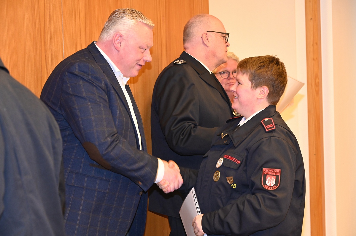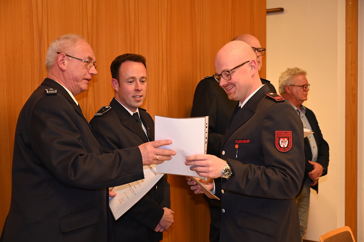 Wie aktiv die Löschgruppe Lüchtringen ist, zeigte der Jahresbericht von Löschgruppenführer Andreas Bohnenpoll. Im vergangenen Jahr rückte die Löschgruppe insgesamt 32 Mal zu Einsätzen aus, wie auch in den Jahren zuvor. Darunter waren zahlreiche Verkehrsunfälle, Brände sowie Unterstützungen für den Rettungsdienst. Besonders im Gedächtnis geblieben sind Einsätze wie der Kohlenmonoxid-Gasunfall an der Kirche, bei dem zwei junge Menschen ums Leben kamen, ein Pkw in der Weser bei Höxter sowie eine Hausgeburt, bei der die Feuerwehr als Tragehilfe für den Rettungsdienst alarmiert wurde und auch die Drehleiter aus Höxter zum Einsatz kam. „So einen freudigen Einsatz haben wir nicht alle Tage“, betonte Bohnenpoll rückblickend. Im Anschluss folgten Ehrungen und Beförderungen. Das Feuerwehrehrenzeichen des Landes Nordrhein-Westfalen in Gold verlieh Bürgermeister Daniel Hartmann an Hauptfeuerwehrmann Rolf Hillebrecht, Hauptbrandmeister Andreas Klie, Hauptfeuerwehrmann Jens Lippelt sowie Unterbrandmeister Oliver Heine. Das Ehrenzeichen in Silber für 25 Jahre aktiven Feuerwehrdienst erhielt Unterbrandmeister Sebastian Heine.