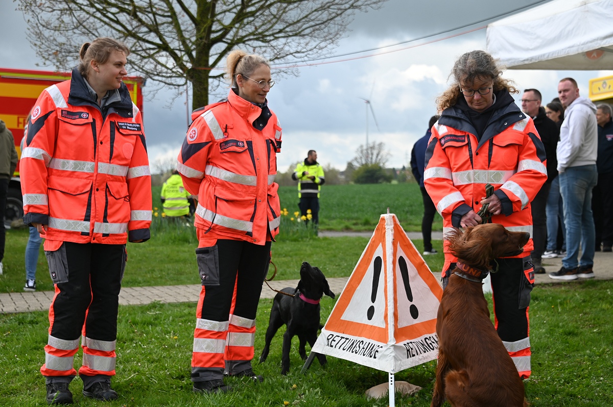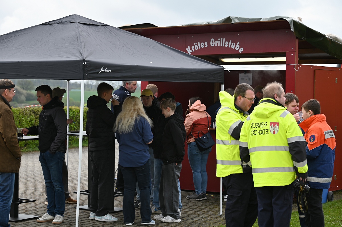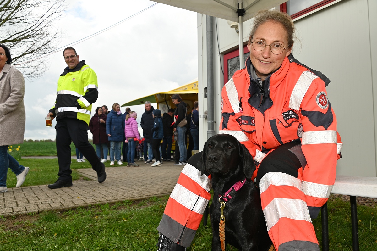 Ein besonderer Anziehungspunkt waren die Vorführungen und eine kleine Fahrzeugschau. Neben den Einsatzfahrzeugen der örtlichen Kräfte aus Bödexen und Fürstenau präsentierte der Löschzug Höxter unter anderem seine Drehleiter sowie seinen Rüstwagen. Auch der Einsatzleitwagen 2 des Kreises Höxter war vor Ort und stellte seine neue Drohnenstaffel vor, die bei Einsätzen zunehmend an Bedeutung gewinnt. Ergänzt wurde das Programm durch die Rettungshundestaffel Höxter-Lippe, die mit einer Vorführung eindrucksvoll ihr Können demonstrierte. Unter der Federführung von Hundeführerin Jutta Sprenger gewährte die Hundestaffel Einblicke in die Ausbildung der Rettungshunde und demonstrierte das Anzeigen von Personen mit dem sogenannten „Verbellen“, wie es der Fall ist, wenn eine Person beispielsweise im Wald durch den Hund aufgefunden wird.