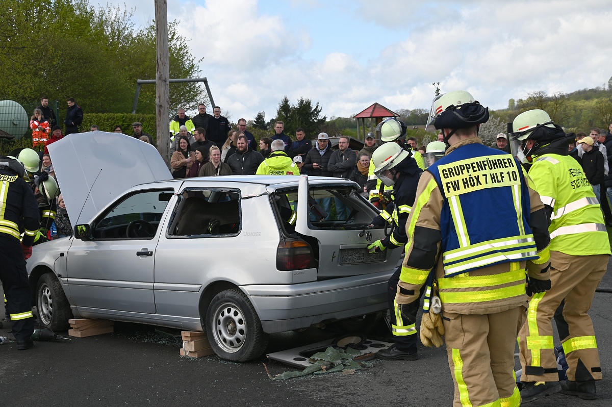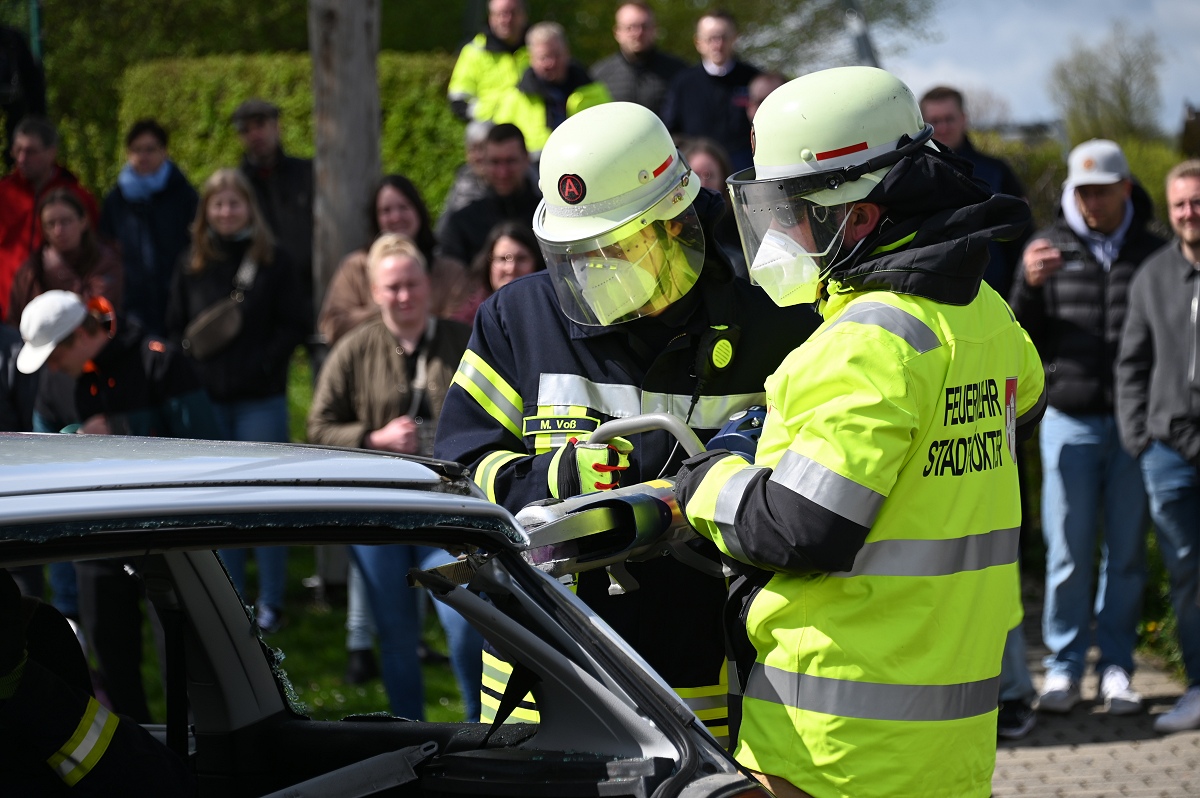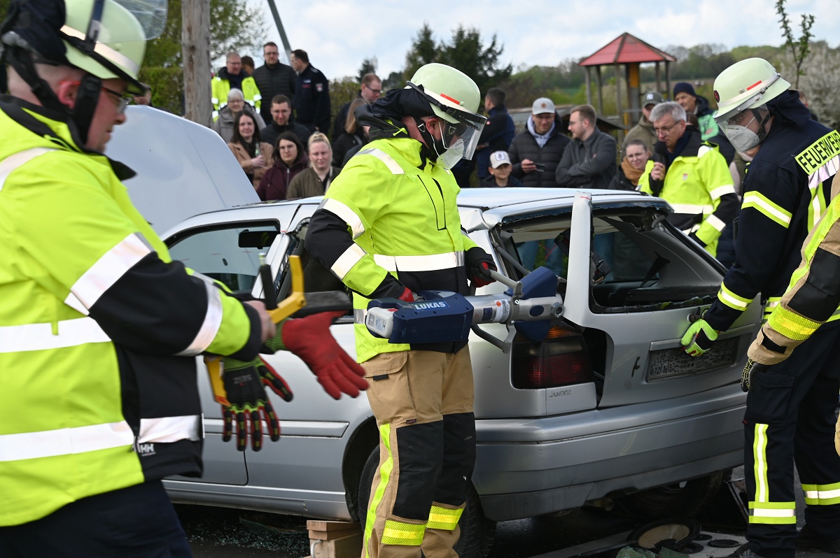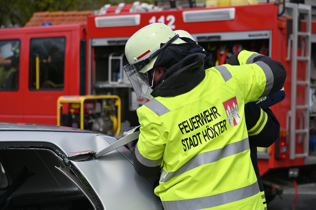 Großes Interesse zog zudem eine realitätsnahe Einsatzübung auf dem Schützenplatz auf sich. Die Löschgruppe Fürstenau zeigte gemeinsam mit dem Löschzug Höxter, wie die Feuerwehr bei einem Verkehrsunfall mit eingeklemmter Person vorgeht. Vor den Augen von dutzenden Zuschauern wurde ein ausgemusterter Pkw fachgerecht zerlegt, um eine schonende Rettung des „Verletzten“ zu ermöglichen. Dabei musste unter anderem das Fahrzeugdach entfernt werden, um die verunfallte Person aus dem Fahrzeug zu befreien. Auch personell gab es einen wichtigen Moment: Der stellvertretende Leiter der Feuerwehr Höxter, Rainer Höppner, nahm die Ernennung zweier Führungskräfte vor. Die Brüder Benedikt und Philipp Meise wurden für weitere sechs Jahre in ihren Funktionen als Löschgruppenführer bestätigt. Benedikt Meise bleibt Löschgruppenführer, während Philipp Meise weiterhin als sein Stellvertreter fungiert.