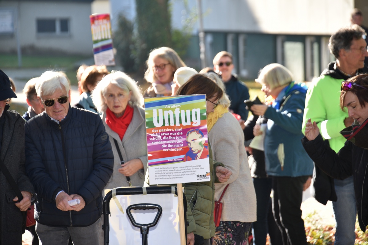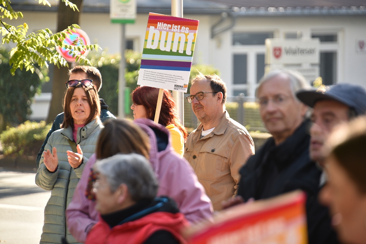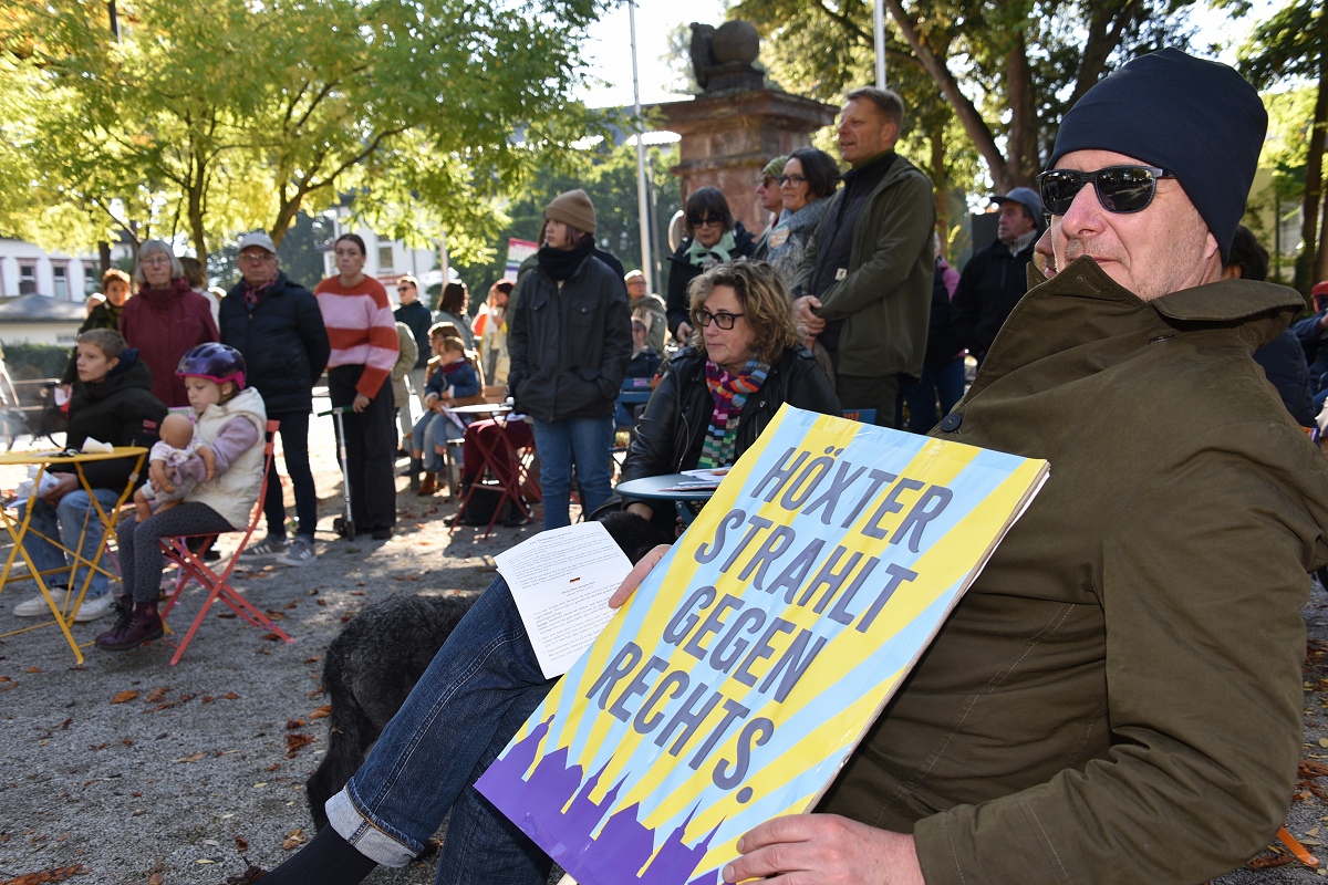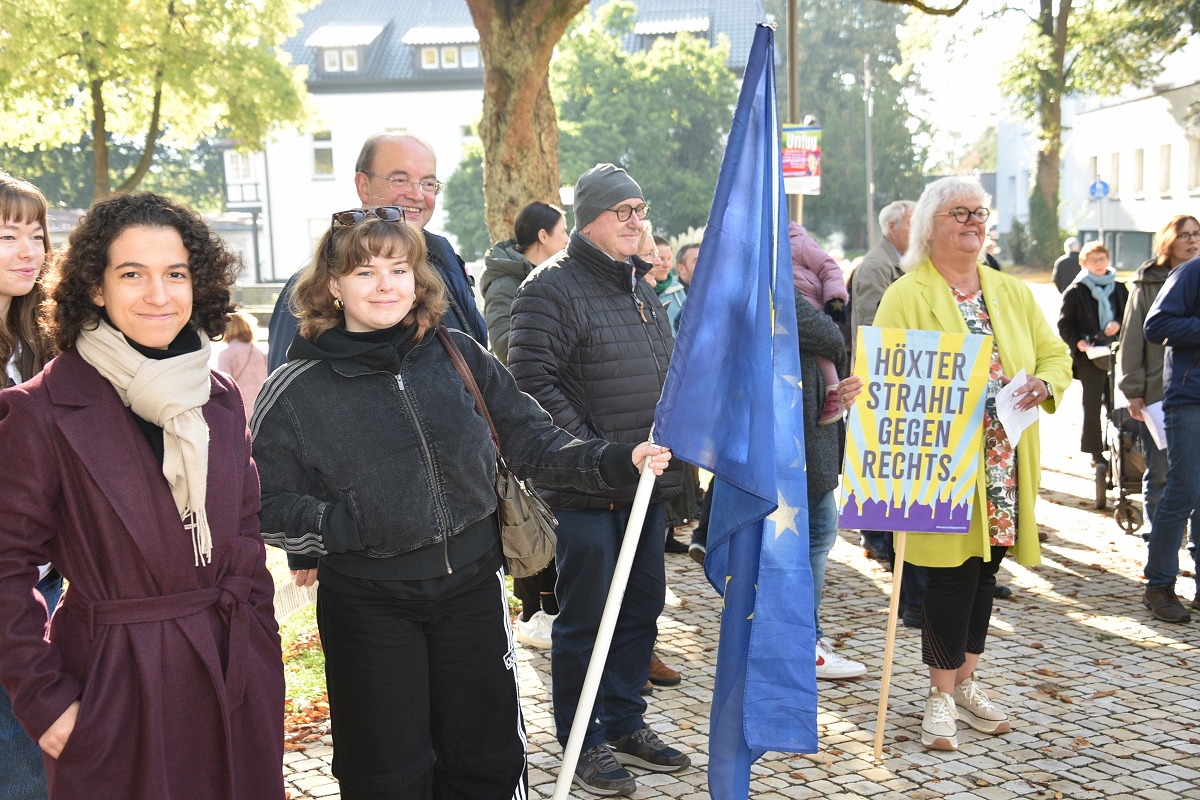 Höxter (TKu). Etwa 100 Teilnehmende setzten am Tag der Deutschen Einheit ein besonderes Zeichen für „Einigkeit und Recht und Freiheit“. Organisiert vom „Bündnis für Demokratie und Vielfalt Höxter“ haben die 100 Teilnehmer mit dem vom Aller.Land-Programm geförderten Projekt „Starke Worte. Starke Orte“ ein klares Zeichen für Freiheit, Toleranz und Zusammenhalt gesetzt. Über der Veranstaltung stand das Motto „Einigkeit und Recht und Freiheit“, Worte, die aktueller denn je wirken. Versammlungsleiter und Bündnis-Sprecher Helmut Lensdorf eröffnete die Kundgebung: „Wir wollen Haltung zeigen für Demokratie und Vielfalt.“ Damit gab er den Ton für ein Programm vor, das Politik, Kultur und Musik miteinander verband. Für den musikalischen Rahmen sorgte Singer-Songwriter Phil Solo aus Detmold zusammen mit dem Musiker Hans Hermann Jansen, die das Thema „Zusammenhalt und Solidarität“ eindringlich vertonten. Maja Machalke vom Projektteam „Starke Worte. Starke Orte“ nahm die berühmten Hymnenzeilen zum Anlass für eine pointierte Analyse. „Einigkeit bedeutet, auch Unterschiedlichkeit auszuhalten. Recht heißt, das Richtige zu tun. Und Freiheit bedeutet nicht, alles machen zu können, was man will, sondern dass alle ihren Freiheitsraum leben dürfen.“ Ihre Worte waren zugleich Einladung und Ermutigung, das Ideal der Nationalhymne auf das Heute zu beziehen.