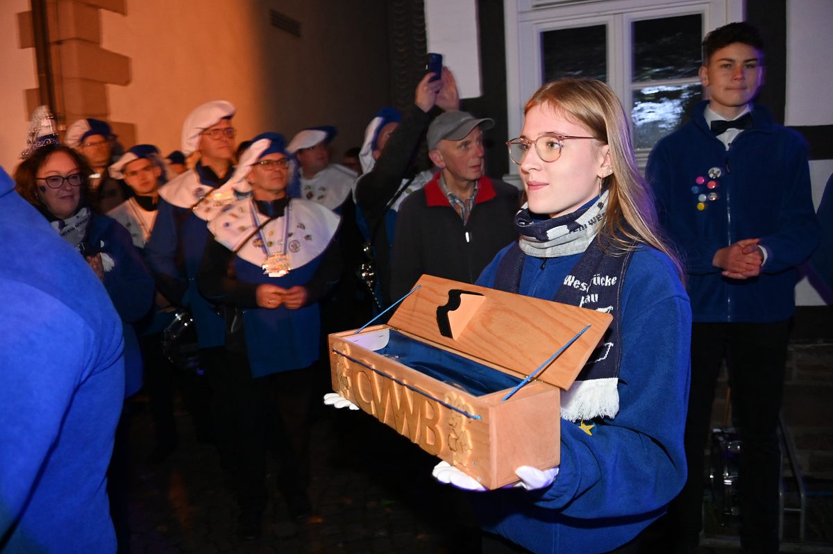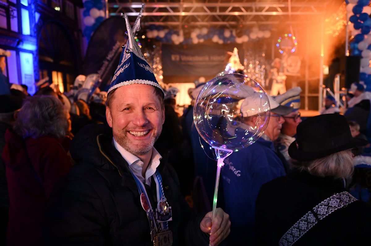 Lauenförde/Beverungen (TKu). Musik, Tanz und ausgelassene Carnevalsstimmung an der Ländergrenze ist der CVWB in die neue Carnevalssession gestartet: Der Carnevalsverein Weserbrücke e.V. (CVWB) feiert in diesem Jahr sein 50-jähriges Vereinsjubiläum, und wie immer mit einem dreifach donnernden „Weserbrücke Helau!“ Unter dem Motto „Der CVWB glitzert grenzenlos – im Dreiländereck ist richtig was los!“ erlebten zahlreiche Närrinnen und Narren einen Auftakt, der ausgelassener kaum sein könnte. Die Jecken aus Beverungen und Lauenförde ließen es sichzunächst nicht nehmen, traditionsgemäß den Schlüssel zum Roten Rathaus in Lauenförde zu erobern und das Rathaus zu erstürmen. Die Wächter des Schützenvereins Lauenförde von 1882 e.V. rückten mit einer schweren Kanone, einer kleinen Schützen-Armee und einem massiven Schlagbaum an, um das Gebäude gegen die närrische Übermacht zu verteidigen. Auch zwei Burgwächter aus Beverungen, motiviert durch den neu gewählten Bürgermeister Tino Wenkel, stellten sich den Karnevalisten entgegen. Doch trotz ihrer lautstarken Verteidigungsstrategie blieb der Sieg der Jecken unausweichlich: Die Damen der blau-weißen Garde eröffneten den Angriff mit Konfetti-Kanonen, gefolgt von der Alten Garde, die mit Regenschirmen ein ungewohntes, aber wirkungsvolles Bild bot. Schließlich ebneten die männlichen Karnevalisten den Weg, indem sie den Schlagbaum kurzerhand beiseite räumten und so die Verteidigungslinie durchbrachen. Unter großem Jubel zog die Narrenschar ins Rathaus ein. „Besser könnte unsere Jubiläumssession nicht beginnen!“, freute sich CVWB-Präsident Daniel Zarnitz über den erfolgreichen Auftakt.