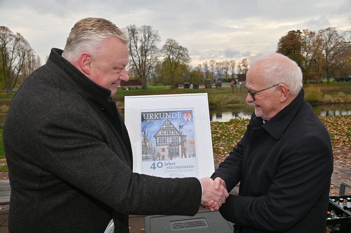 Bürgermeister Daniel Hartmann würdigte dieses Engagement und überreichte dem Freundeskreis im Namen der Stadt Höxter eine Ehrenurkunde. In seiner Rede erinnerte er an die Gründung im Kaminzimmer von Schloss Corvey und an die besondere Mischung der damaligen Runde: Handwerker, Kaufleute, Juristen, Unternehmer und ein Gastronom. „Eine Art Stadtsymphonie“, wie Hartmann es formulierte, „in der jeder ein anderes Instrument spielt, aber gemeinsam ein Klang entsteht, der sich hören lassen kann.“ Er hob hervor, wie selbstverständlich der Freundeskreis dort einspringe, wo Aufgaben sonst hätten liegen bleiben können. Die Dynamiker hätten nicht nur Steine restauriert, sondern Erinnerungsräume bewahrt; nicht nur Anlagen gebaut, sondern Freiheitsorte geschaffen; nicht nur Toiletten errichtet, sondern gezeigt, was möglich sei, wenn Bürgerinnen und Bürger Verantwortung übernehmen. „Der Funke aus jenem Kaminzimmer von 1985 brennt weiter. Und er leuchtet noch immer hell genug, um die nächsten Jahre Höxter ein Stück weit mitzugestalten“, so der Bürgermeister.