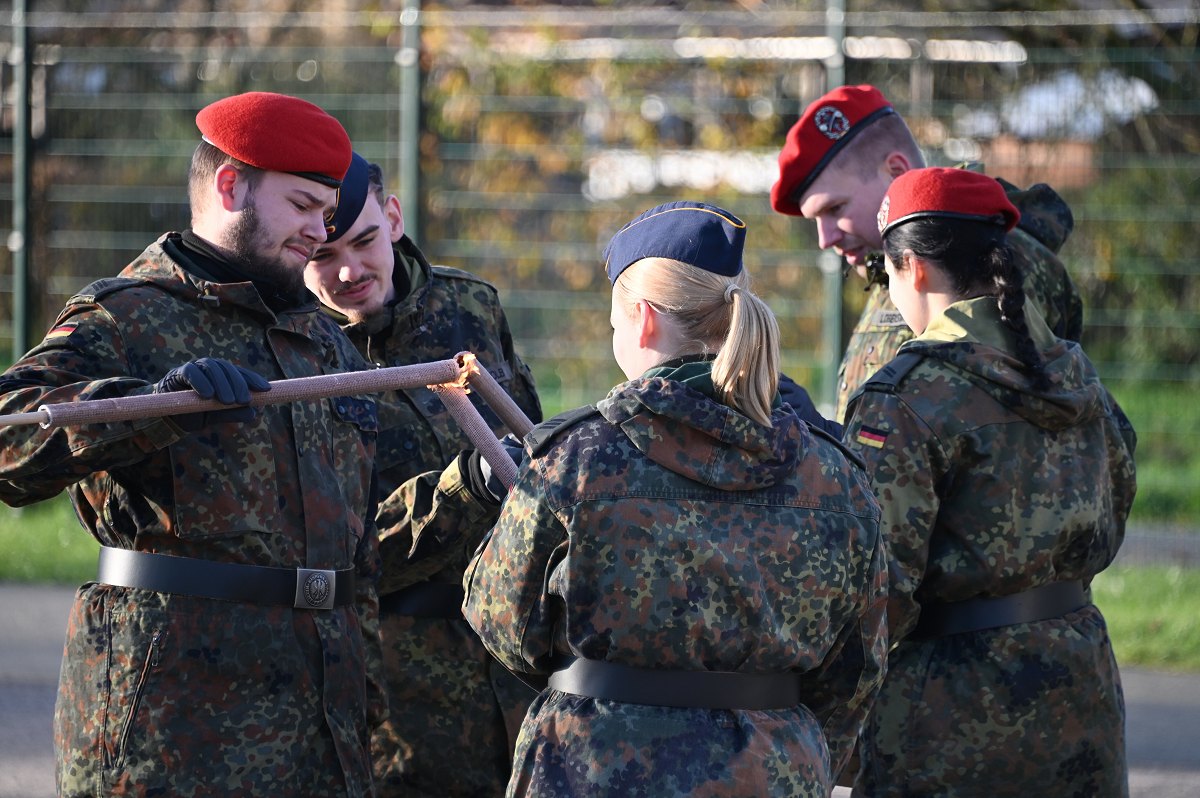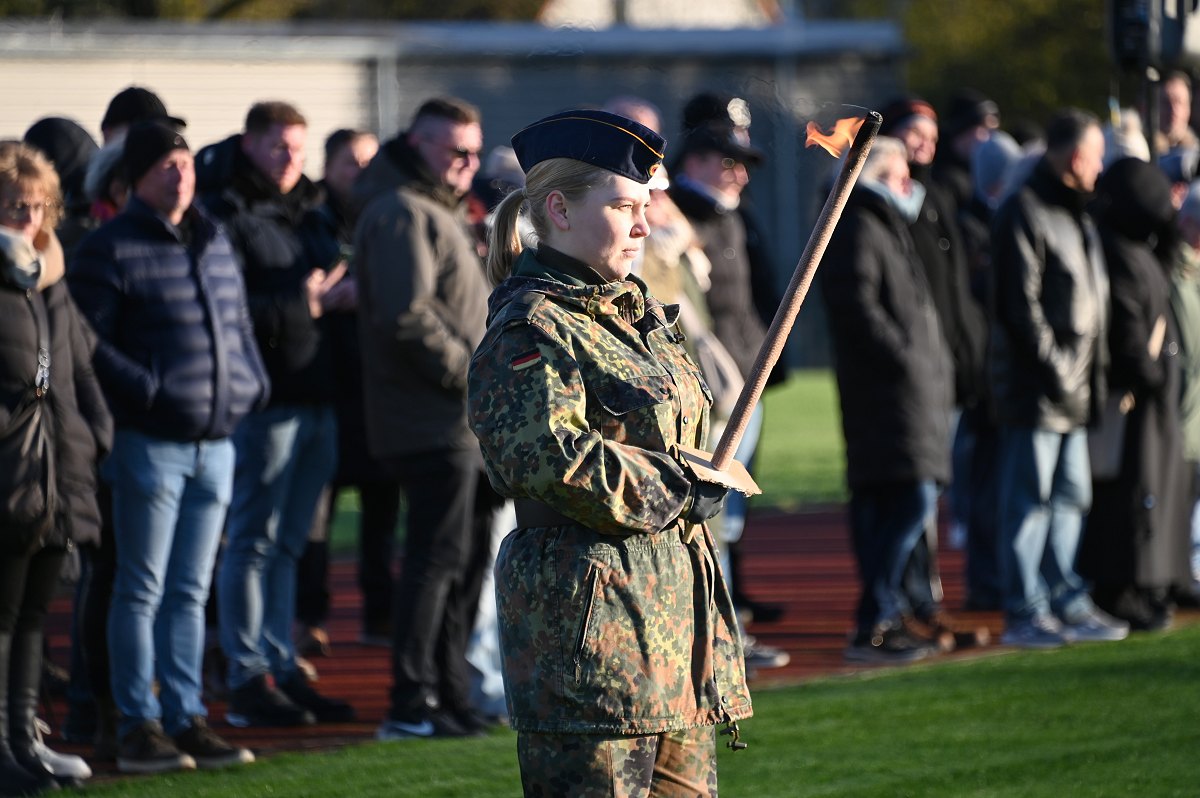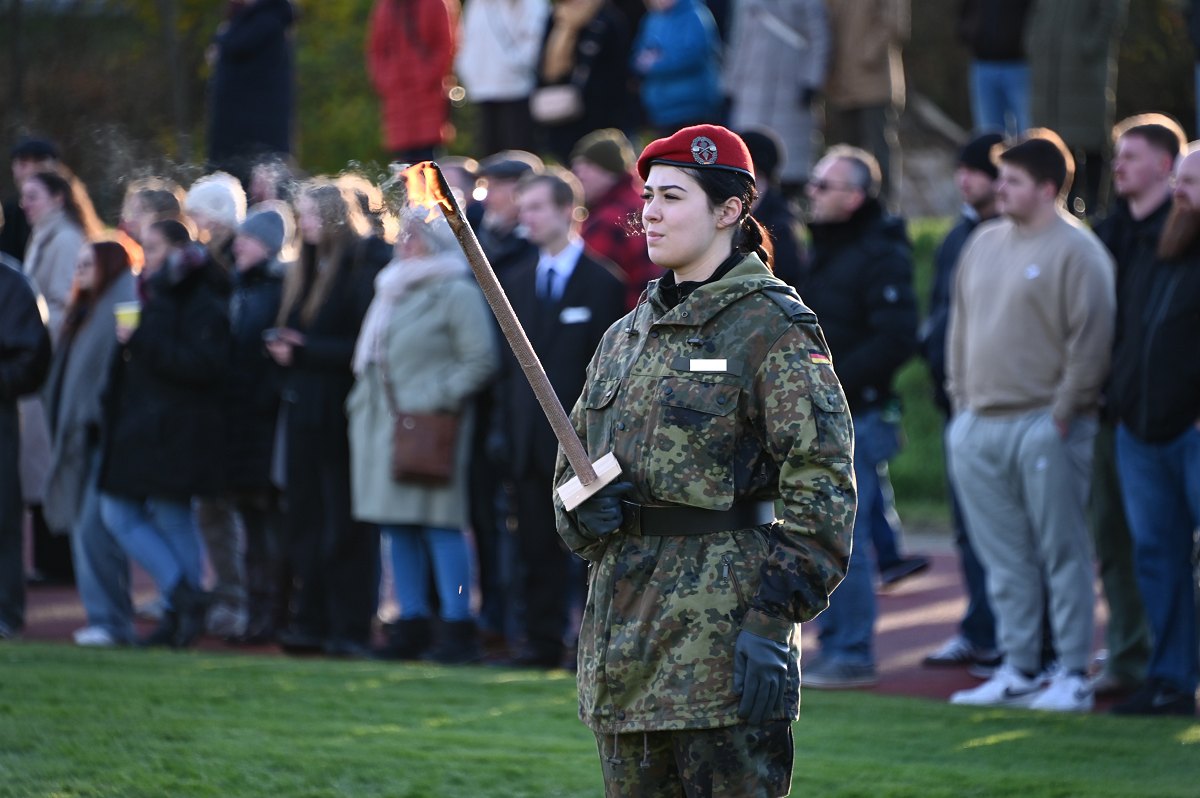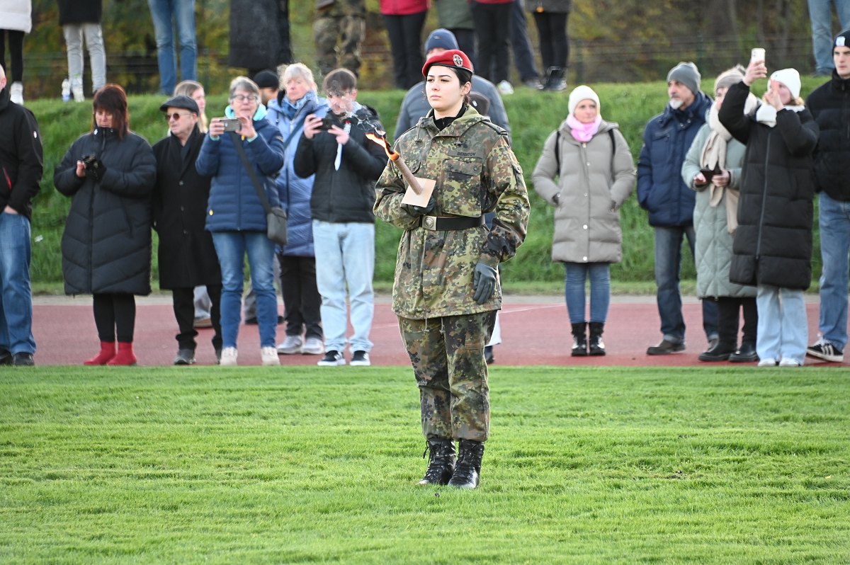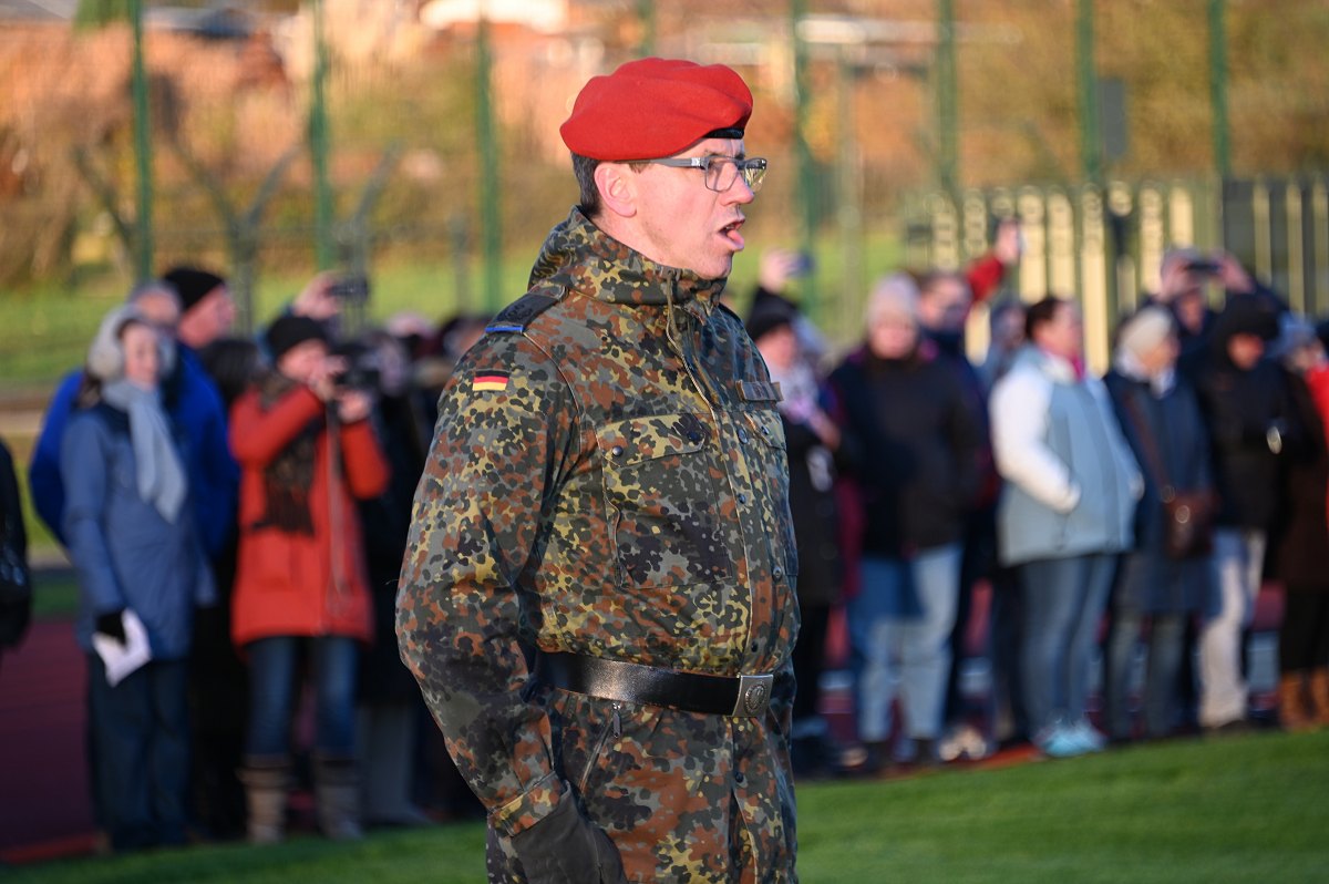 Höxter (TKu). In der Hammerstein-Equord-Kaserne in Höxter fand am vergangenen Donnerstagnachmittag erstmals seit der Umbenennung der Liegenschaft ein feierliches Gelöbnis auf dem großen Sportplatz statt. 220 Rekrutinnen und Rekruten der Schule für Feldjäger und Stabsdienst aus Hannover, 40 Rekruten des ABC-Abwehrregiments 7 aus Höxter und 30 Rekruten des Panzerpionierbataillons 1 aus Holzminden waren angetreten, um vor mehr als 1.000 Zuschauerinnen und Zuschauern ihr Treueversprechen gegenüber der Bundesrepublik Deutschland abzulegen. Für alle Beteiligten war es ein besonderer Moment, der von Musik, Tradition und spürbarer Anspannung begleitet wurde.