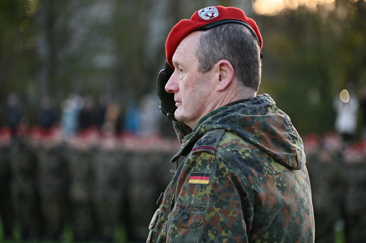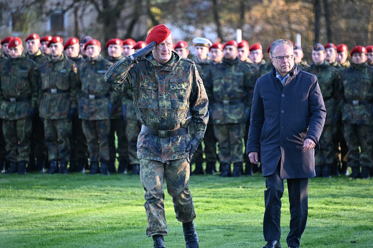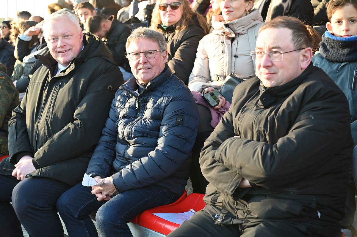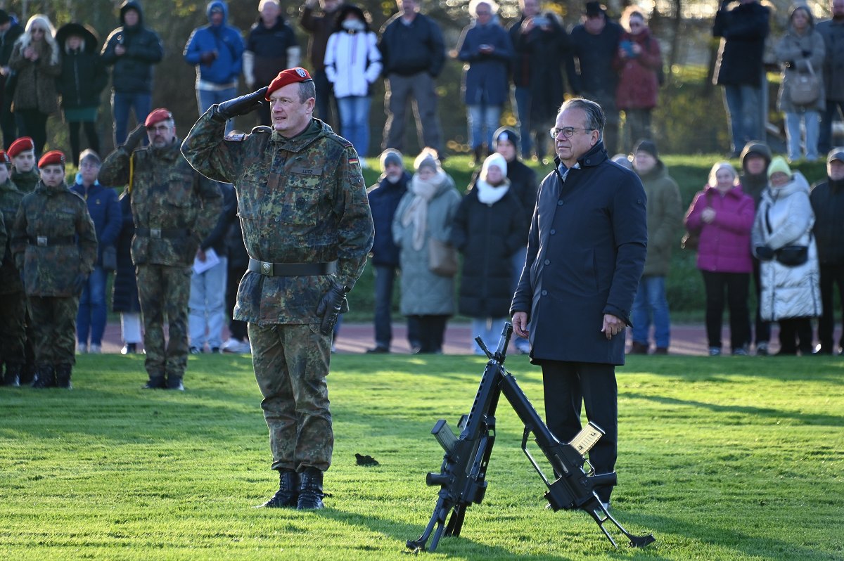 Besondere Aufmerksamkeit galt den 18 Rekrutinnen und Rekruten, die stellvertretend für alle Angetretenen vor die Truppenfahnen traten. Im Anschluss ergriff Dr. h.c. Frank-Jürgen Weise, Oberst der Reserve, das Wort. In seiner eindrucksvollen Rede machte er deutlich, dass Freiheit und Recht zu verteidigen längst keine Floskel mehr seien. Er sprach offen über sicherheitspolitische Herausforderungen, die Europa heute beschäftigen, und warnte vor den zunehmenden hybriden Bedrohungen, die längst im Alltag angekommen seien. Zugleich betonte er, dass Deutschland trotz aller Spannungen nicht in unmittelbarer Kriegsgefahr stehe, auch, weil die Stärke der NATO eindeutig sei. Vor allem aber richtete er seinen Blick auf die Rekrutinnen und Rekruten: Ihr Dienst sei wertvoll, ihre Ausbildung bedeutend, und die Erfahrungen, die sie sammeln, könnten sie ein Leben lang prägen.
