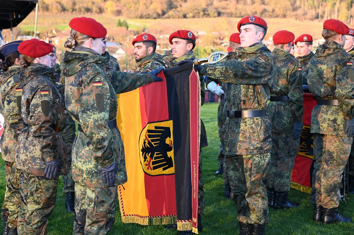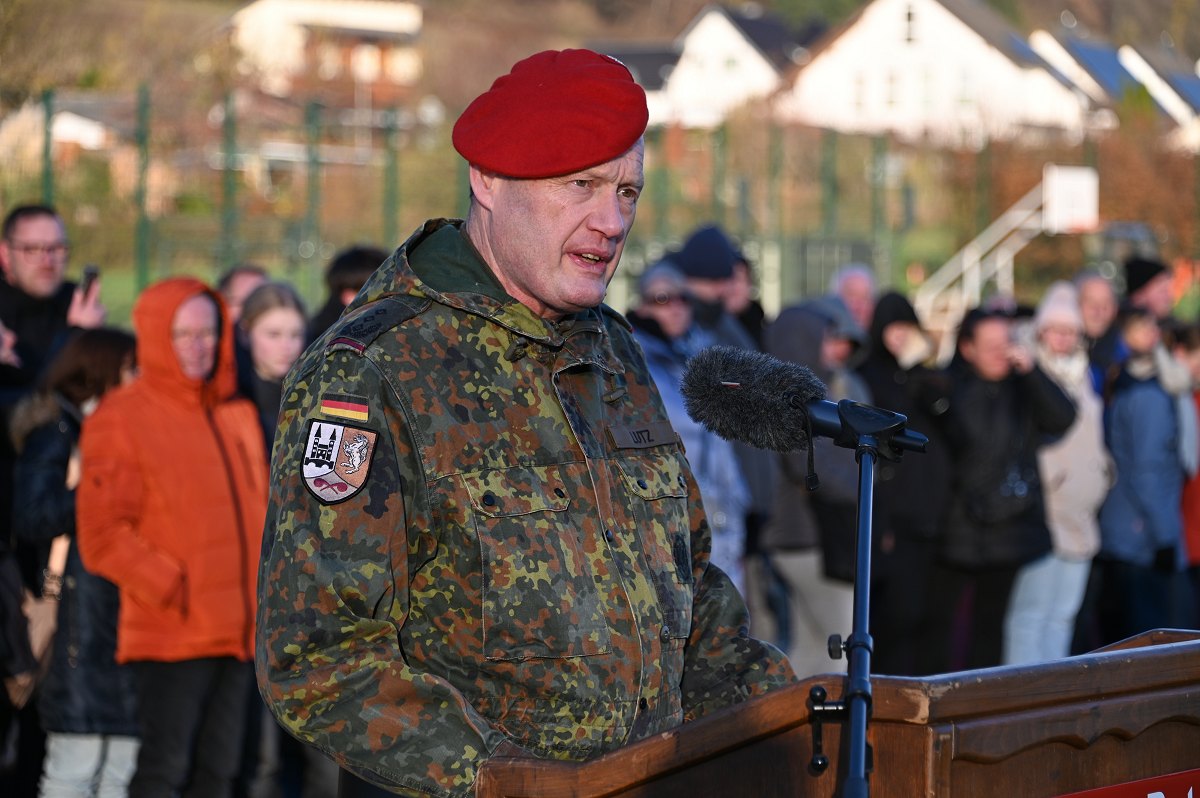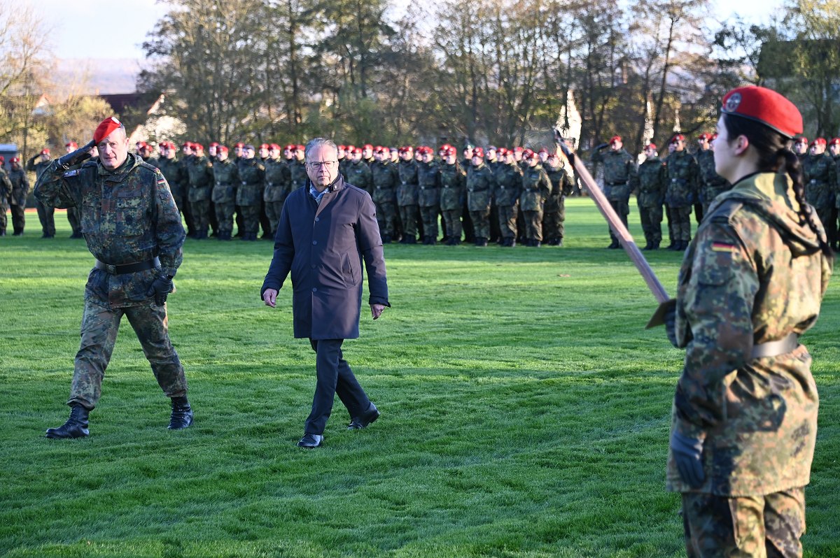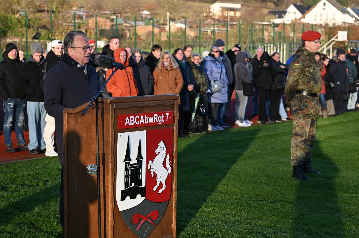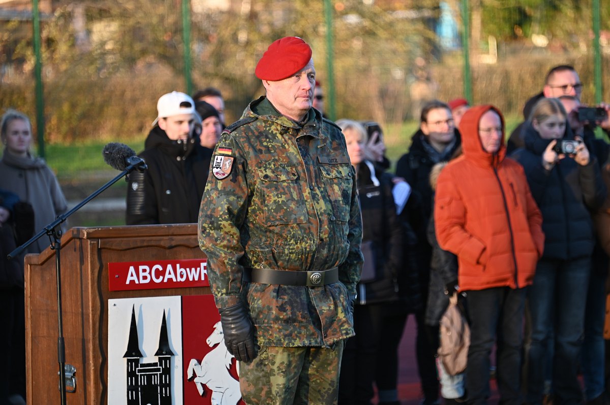 Pünktlich um 15 Uhr marschierten die Gelöbnisverbände auf den Sportplatz, gefolgt von der Ehrenformation und den Truppenfahnen, die von den Klängen des Heeresmusikkorps Kassel unter der Leitung von Hauptmann Christoph Schiffers getragen wurden. Nachdem die Verbände eingenommen hatten, meldete der Oberbefehlshaber des ABC-Abwehrregiments 7, Oberst Michael Lutz, die Aufstellung und schritt gemeinsam mit dem Gelöbnisredner die Front ab. In seiner Begrüßungsrede erinnerte Lutz an sein eigenes Gelöbnis im Jahr 1987 in Ostfriesland und daran, wie prägend die Grundausbildung für ihn gewesen sei. Er würdigte die große Zahl der Gäste aus Politik, Bundeswehr, Kommunen und Militärseelsorge und dankte insbesondere den Angehörigen der Rekruten für ihre Unterstützung.
