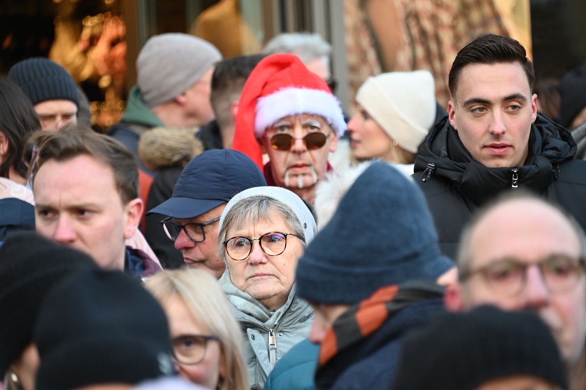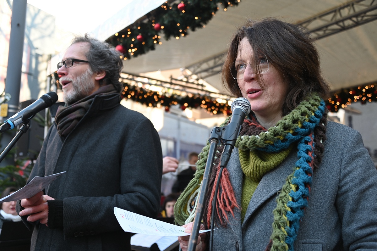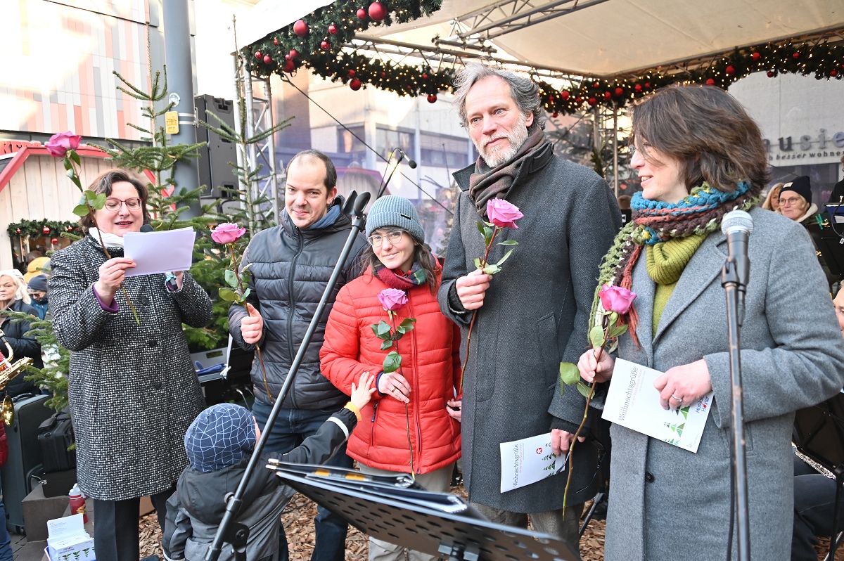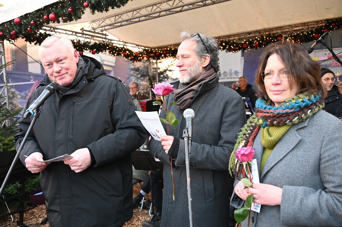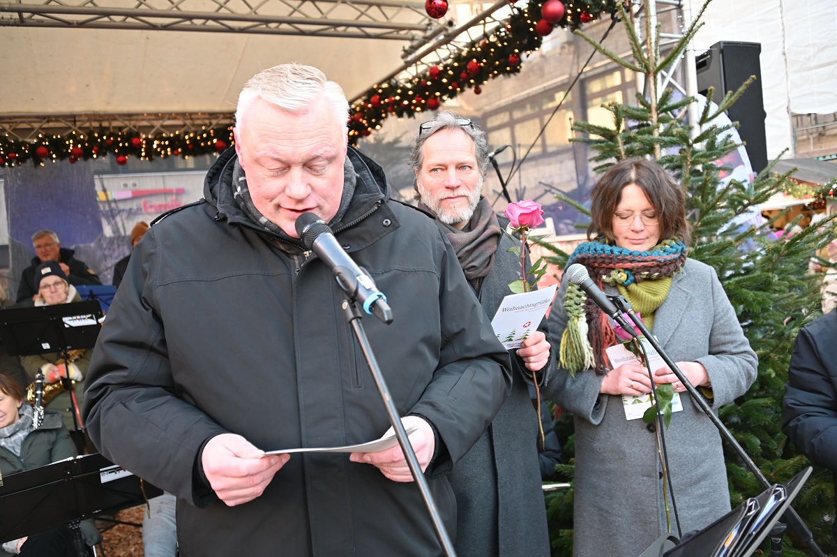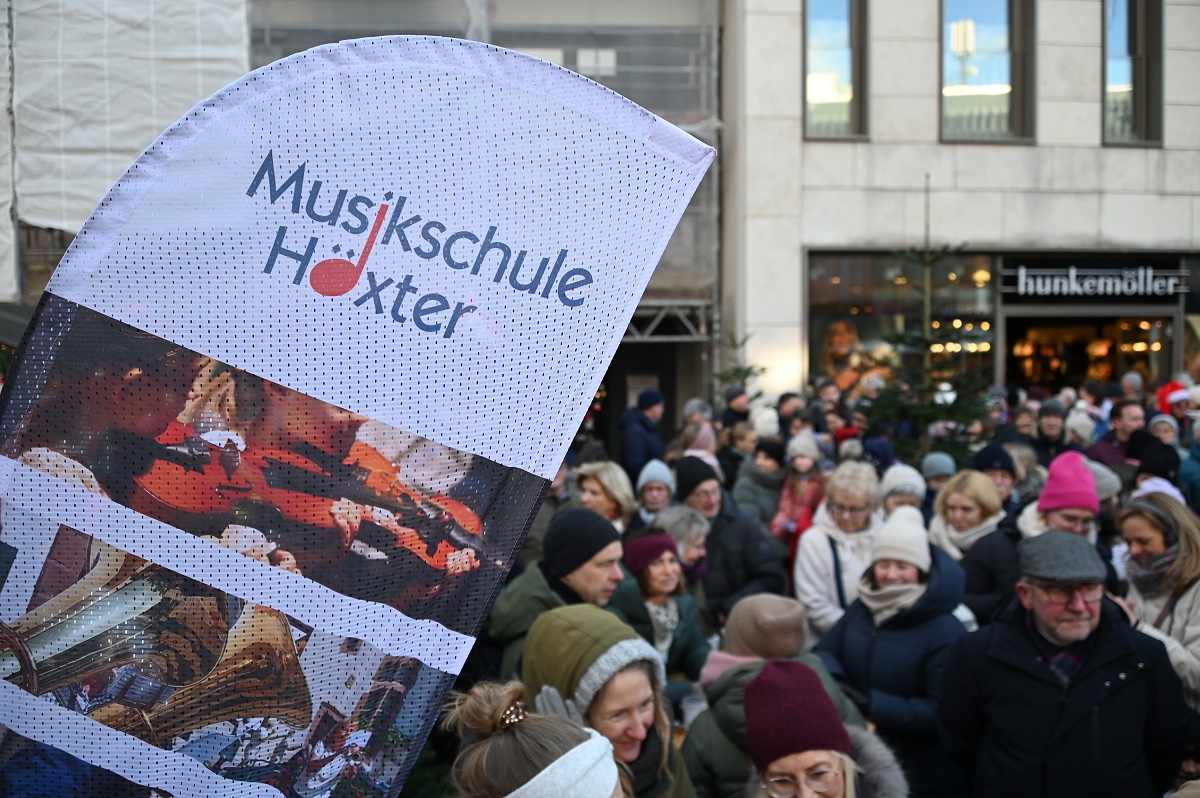 Musikschulleiterin Klaudia Knapp blickte in einer kurzen Ansprache zurück und erinnerte an die Anfänge der Musikschule, die vor wenigen Wochen 65 Jahre alt geworden ist. Ende November 1960 wurde das Jugendmusikwerk laut Claudia Knapp gegründet, der Vorläufer der heutigen Musikschule. Unterstützt wurde das Weihnachtssingen zudem von den Turmbläsern Stefan Balke vom Weserberglandorchester Bödexen und Jonathan Mann von den Hochstiftmusikanten, die vom Balkon über Thalia aus einzelne Musikstücke anstimmten und so für eine besondere Klangatmosphäre sorgten. Bürgermeister Daniel Hartmann wünschte allen Menschen „frohe Festtage“, dankte den Mitwirkenden für ihr Engagement. Er hob den starken Gemeinschaftssinn in Höxter hervor und betonte die Bedeutung des letzten Liedes „Stille Nacht, heilige Nacht“ als Zeichen von Frieden, Hoffnung und Zusammenhalt, ein Lied, das wie kaum ein anderes für Frieden in der Welt steht.