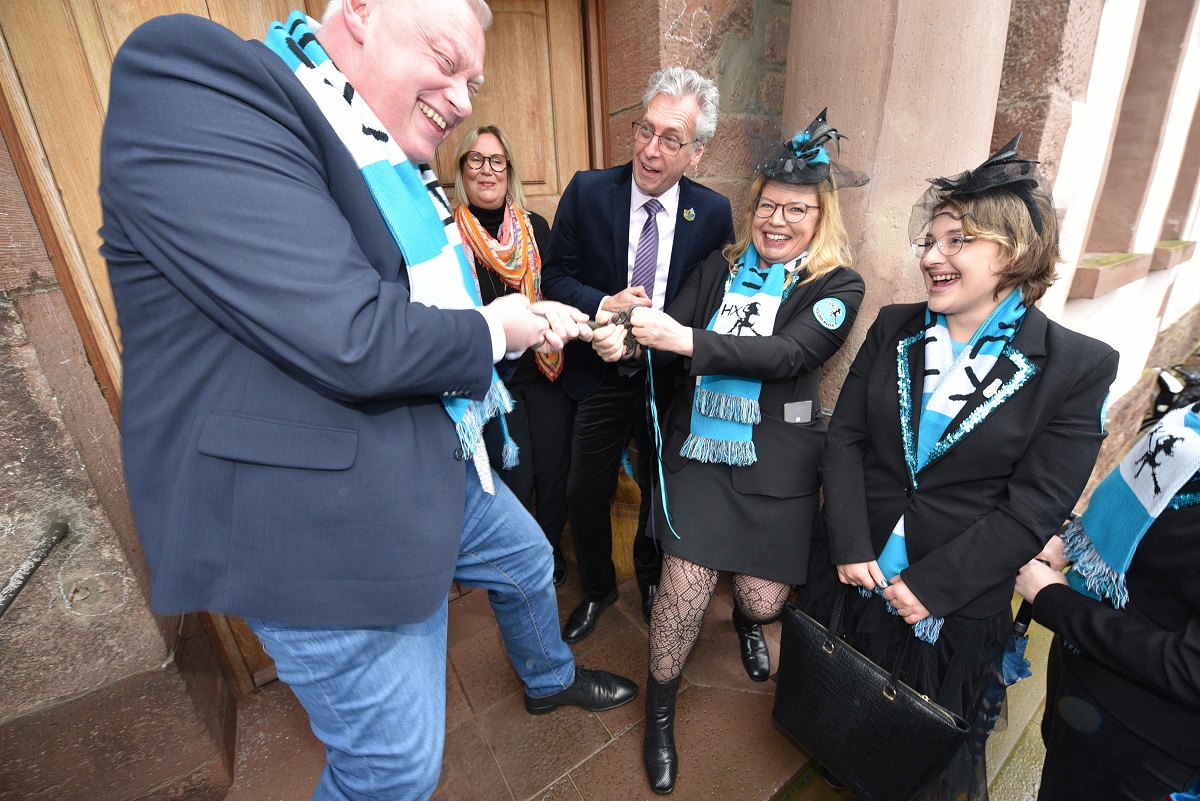 Höxter (TKu). Pünktlich um 11:11 Uhr landete an Weiberkarneval eine große Gruppe der Huxaria-Hexen mit ihren Besen am Höxteraner Stadthaus. Ziel der närrischen Invasion war es, ganz traditionsgemäß, den Rathausschlüssel in die Hände der Huxaria-Hexen zu bringen. Wie in jedem Jahr kam es dabei zu einem symbolischen Ringen mit Bürgermeister Daniel Hartmann sowie den Dezernatsleitern Julia Gogrewe und Stefan Fellmann. Trotz Gegenwehr musste die Stadtspitze letztlich kapitulieren: Der Schlüssel ging an die Huxaria-Hexen, die damit offiziell die närrische Regentschaft übernahmen. Als sichtbares Zeichen der Machtübernahme erhielt Bürgermeister Hartmann zudem einen goldenen Hexenhut, den er unter dem Jubel der Anwesenden aufgesetzt bekam. Nach der erfolgreichen Eroberung richtete Oberhexe Simone Kube das Wort an die Zuschauer. In gereimter Form nahmen die Hexen dabei die leeren Kassen, gestrichene Projekte und die kommunalpolitischen Herausforderungen humorvoll aufs Korn.