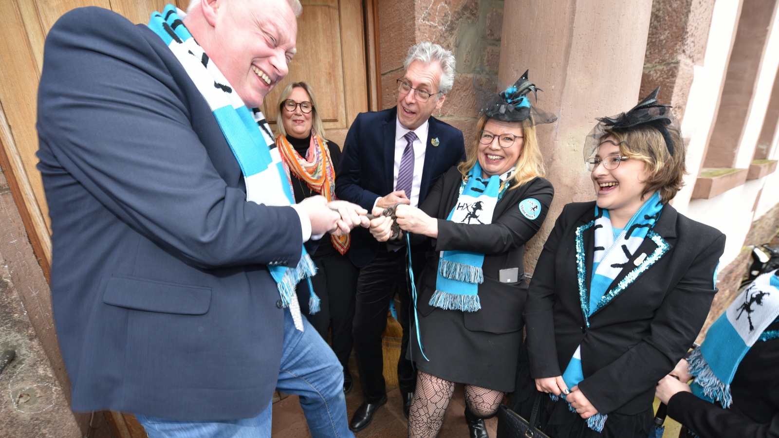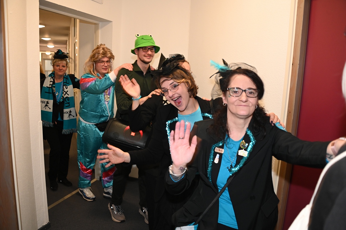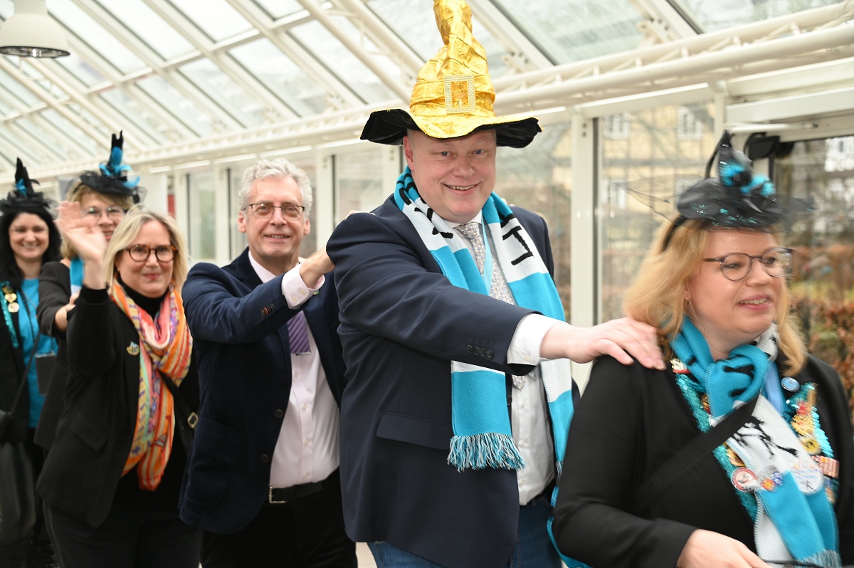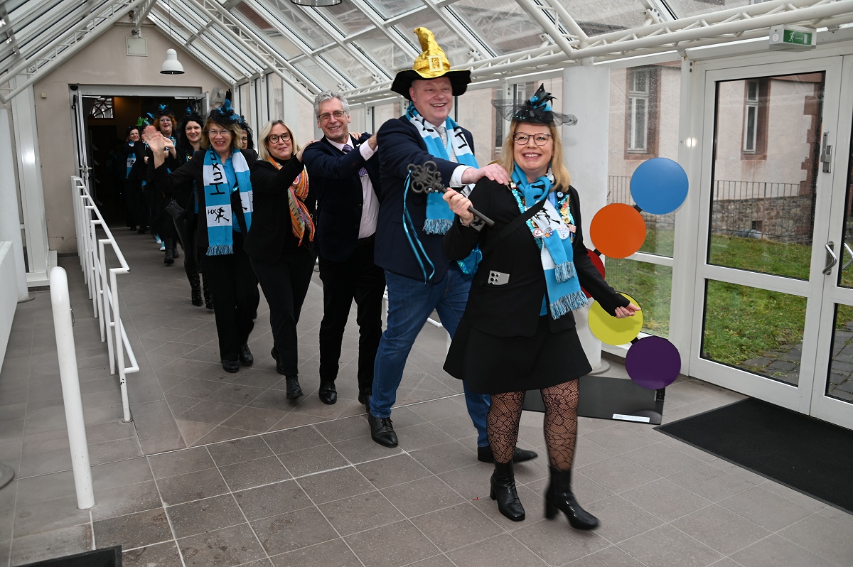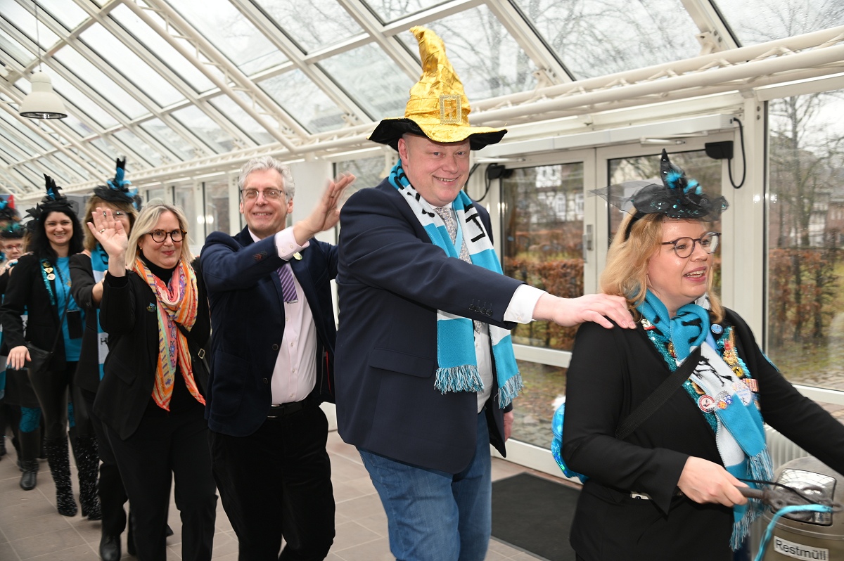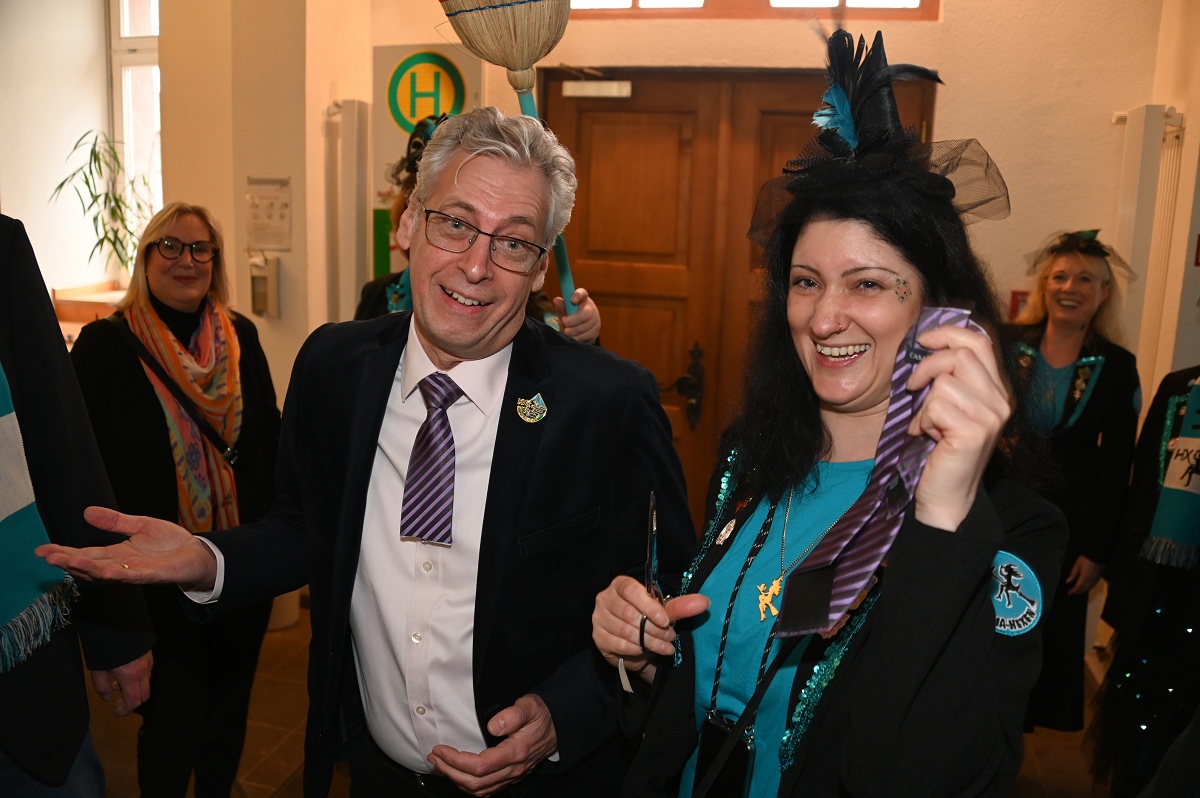 Gleichzeitig riefen sie dazu auf, den Alltag für einen Moment hinter sich zu lassen und die fünfte Jahreszeit mit Freude, Spaß und einem guten Schluck zu feiern. Begleitet wurde die Rede von einem dreifachen „Höxter, Hex, Hex“ und einem närrischen Gruß an den Bürgermeister. Natürlich durfte auch der traditionelle Krawattenbrauch nicht fehlen: „Schnipp, schnapp“ hieß es für Bürgermeister Daniel Hartmann und Dezernent Stefan Fellmann, deren Krawatten fachgerecht gekürzt wurden. Baudezernentin Julia Gogrewe blieb davon verschont und erhielt stattdessen einen Pin der Huxaria-Hexen für ihr Jackett. Zum Abschluss zogen die Hexen zusammen mit den städtischen Würdenträgern und einigen Mitarbeitenden der Stadtverwaltung mit einer große Polonäse fröhlich durch die Flure des Stadthauses.