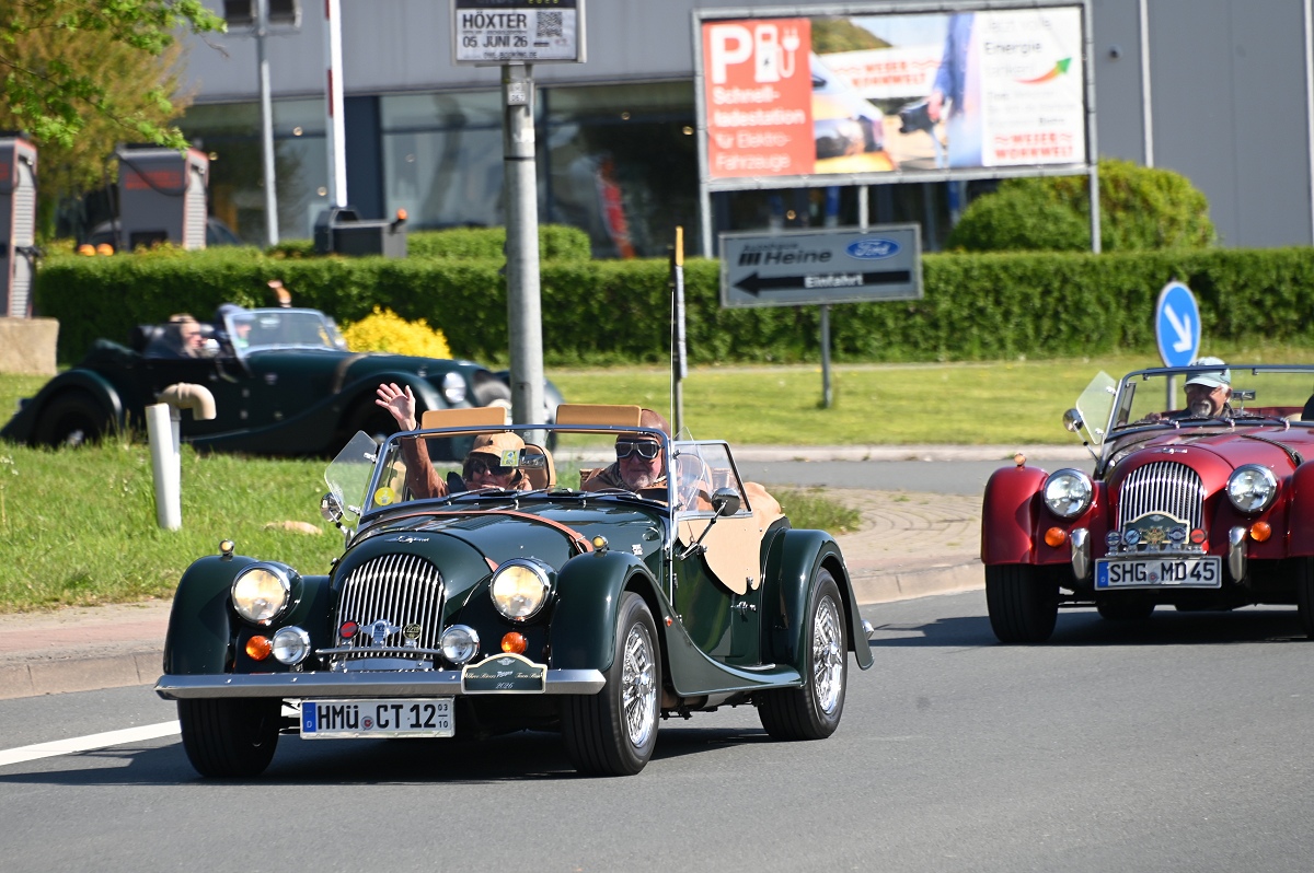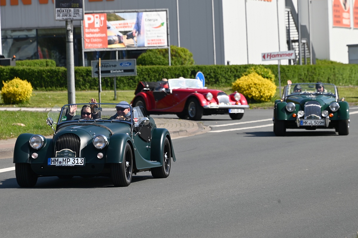 Höxter (TKu). Eine ungewöhnliche Fahrzeugkolonne hat sich am Samstagvormittag bei strahlendem Sonnenschein von Höxter aus durch das Weserbergland in Bewegung gesetzt: 14 handgefertigte Sportwagen der britischen Marke Morgan starteten vom Parkplatz eines Burger-Restaurants zu einer zweitägigen Tour durch die Region.