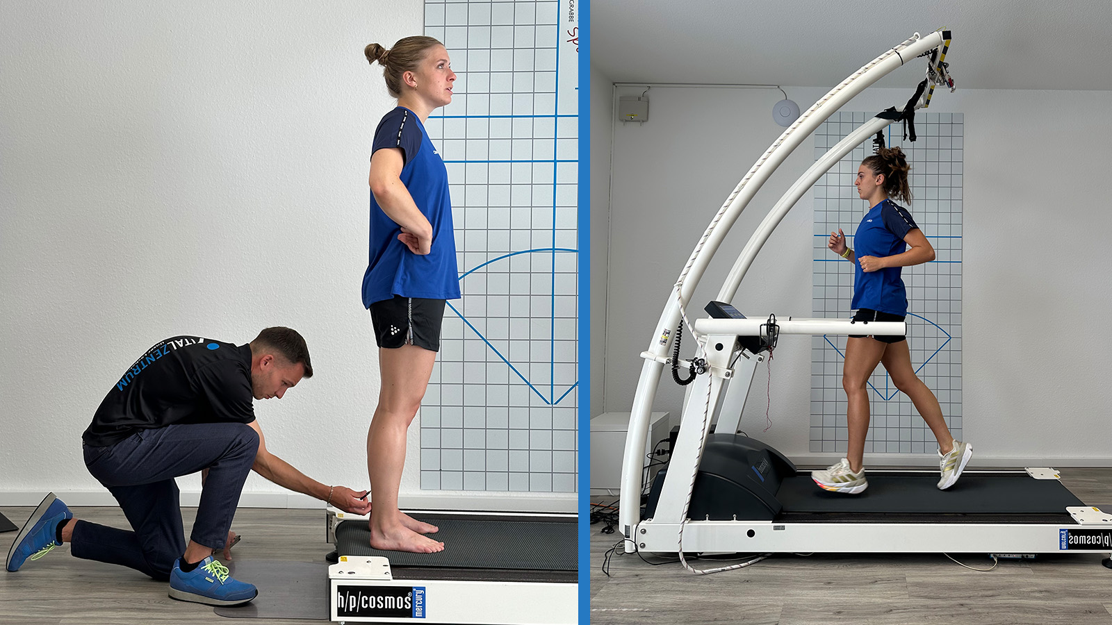 Bei der Laufanalyse im Vitalzentrum laufen die Teilnehmerinnen in Sportkleidung, erst barfuß, auf einem speziellen Laufband. Eine Kamera hinter dem Band erfasst jede Bewegung präzise. Markierungen an den Beinen machen selbst kleinste Fehlstellungen sichtbar. So können Knick-, Rotations- oder Kniefehlstellungen zuverlässig erkannt werden. Anschließend erfolgt ein Vergleich des Laufverhaltens mit Schuhen.