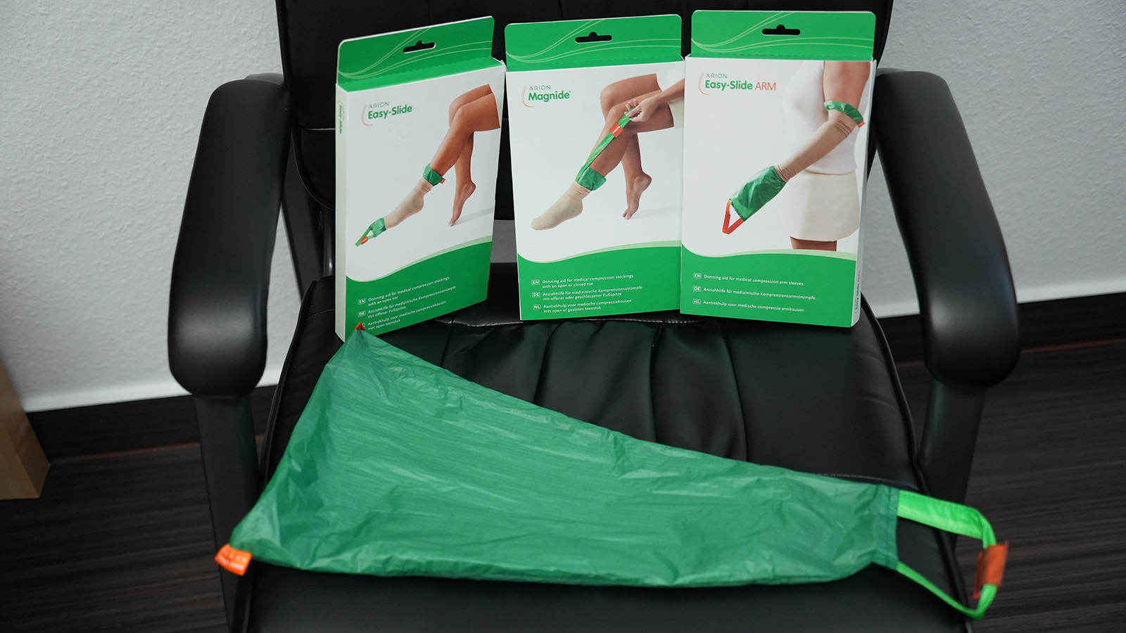 Gerade im Alltag erleichtern Anziehhilfen den Umgang mit Kompressionsstrümpfen erheblich. Besonders verbreitet sind sogenannte Tütenanziehhilfen wie das Modell „Easy Slide“ des Herstellers Arion. Laut Parschau ist die Handhabung dieser Hilfe sehr leicht – für Patienten jeden Alters. Ein großer Vorteil ist der leichte Transport dieses Modells, das in jede Tüte oder Tasche passt.
