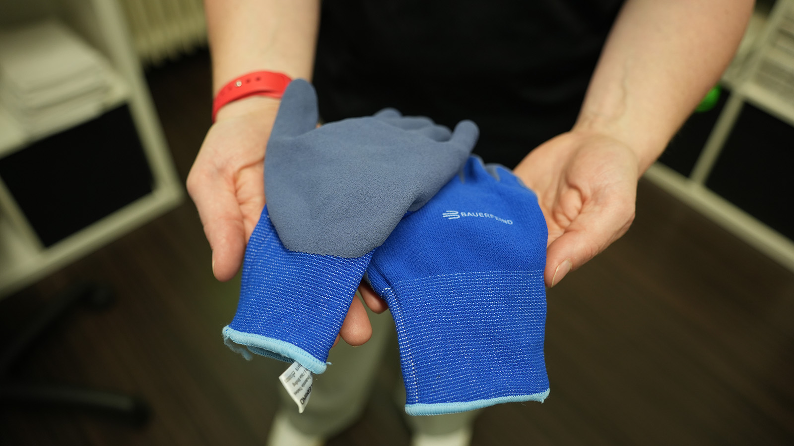 Hilfreich sind dabei spezielle Handschuhe mit gummierten Fingerspitzen. Sie sorgen dafür, dass sich der Stoff des Kompressionsstrumpfes gleichmäßig verteilen lässt und diese optimal auf der Haut sitzen. „Mit den Handschuhen kann man die Kompressionsstrümpfe sehr leicht nochmal anmodellieren“, erklärt Parschau.
